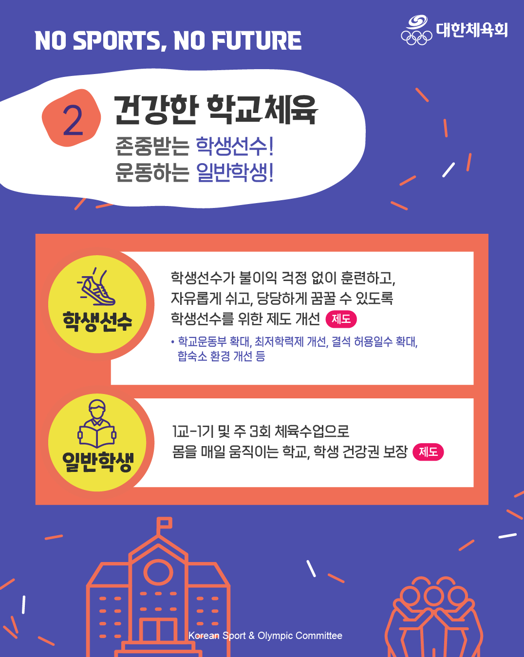 일반학생의 건강한 스포츠 활동을 장려하기 위해 '1교-1기' 및 주 3회 체육수업 등 체육수업을 확대하여 모든 학생이 매일 움직이는 학교를 만들고, 학생선수가 꿈을 이루기 위해 마음껏 훈련할 수 있는 환경을 조성하고자 학교운동부 확대, 최저학력제 개선, 결석 허용일수 확대, 합숙소 환경 개선 등 제도적 기반을 강화한다.