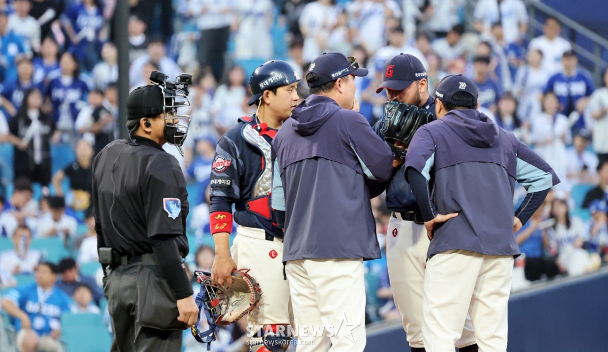 아롯데 반즈 대체외국인선수 감보가 27일 대구삼성라이온즈파크에서 열린 2025 KBO리그 삼성라이온즈와 롯데자이언츠의 경기 2회말 4실점하자 주형광 투수코치가 마운드로 향해 이야기를 나누고 있다. 김성철 구심의 헤드카메라가 눈길을 끈다. 2025.05.27.
