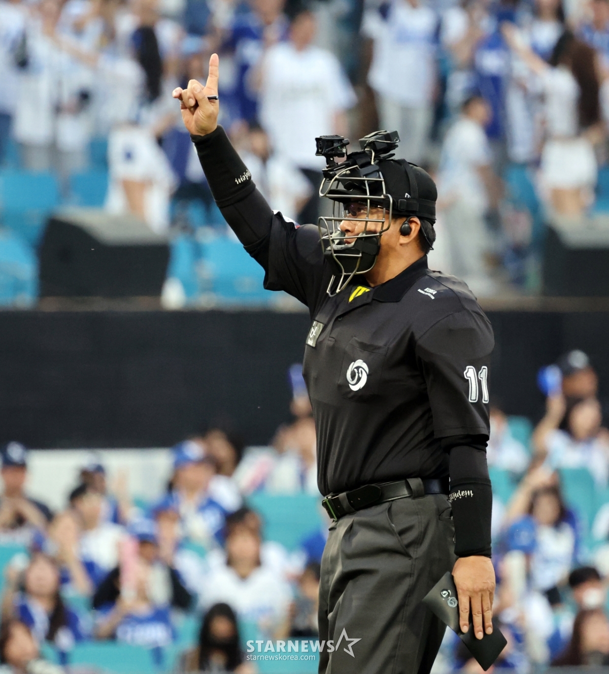 롯데 반즈 대체외국인선수 감보아가 27일 대구삼성라이온즈파크에서 열린 2025 KBO리그 삼성라이온즈와 롯데자이언츠의 경기 2회말 4실점하자 주형광 투수코치가 마운드로 향해 이야기를 나누고 있다. 김성철 구심의 헤드카메라가 눈길을 끈다. 2025.05.27.