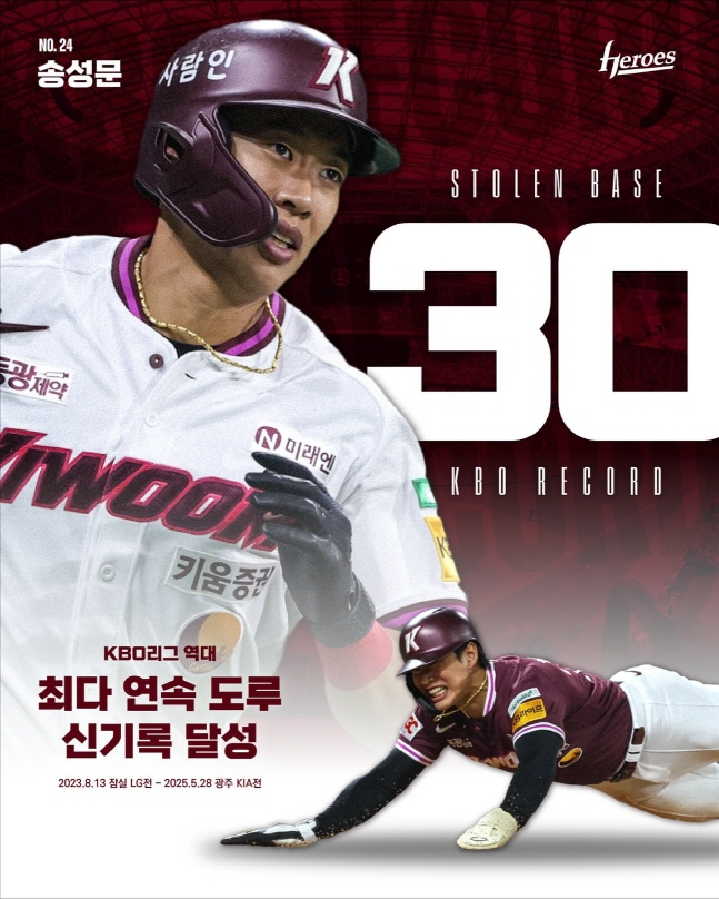 2023년 8월 13일 잠실 LG 트윈스전부터 시작한 송성문의 연속 도루 성공이 30개까지 늘었다. 이로써 이종범 현 KT 위즈 코치가 타이거스 소속이던 1997년 5월 19일 군산 쌍방울 레이더스전부터 6월 27일 잠실 LG전까지 기록한 29개 연속 도루 기록을 갈아치웠다.