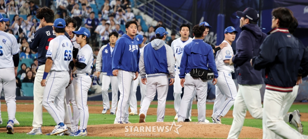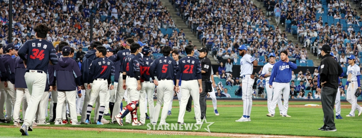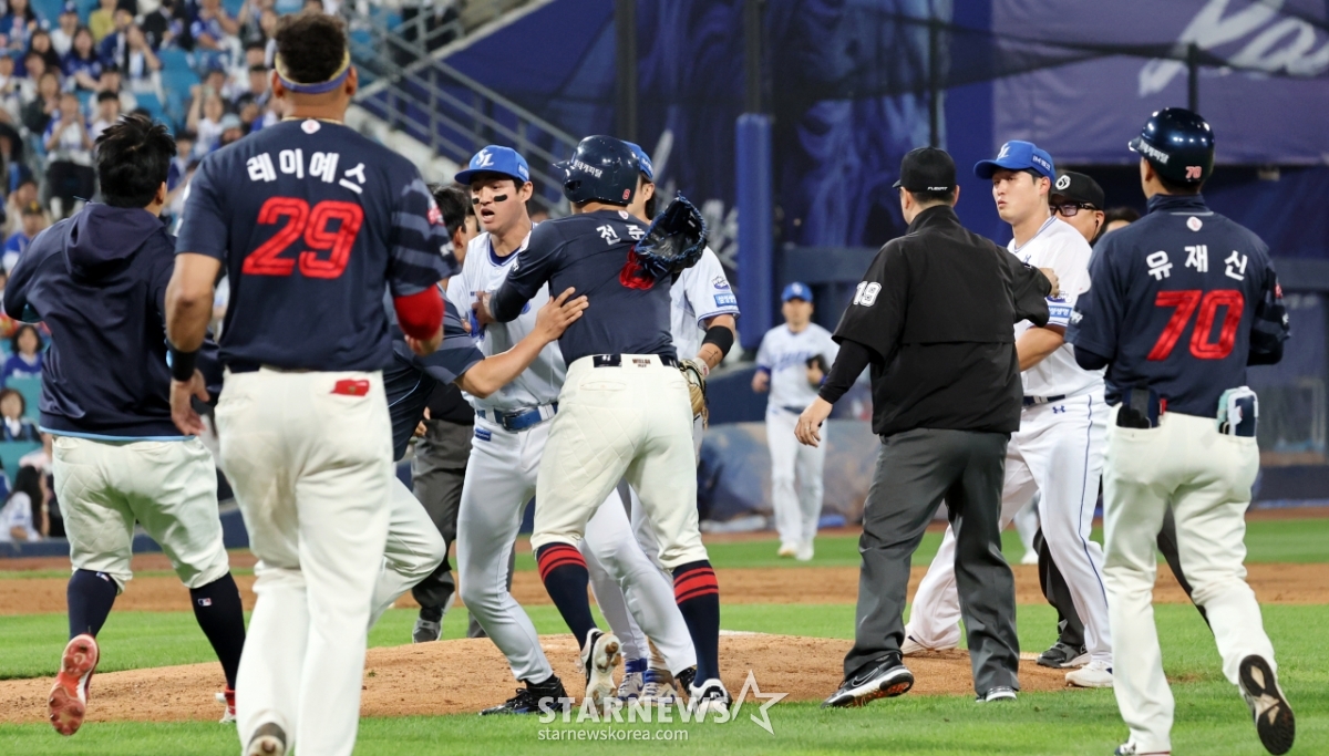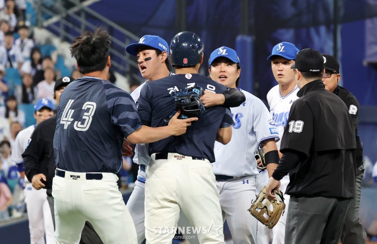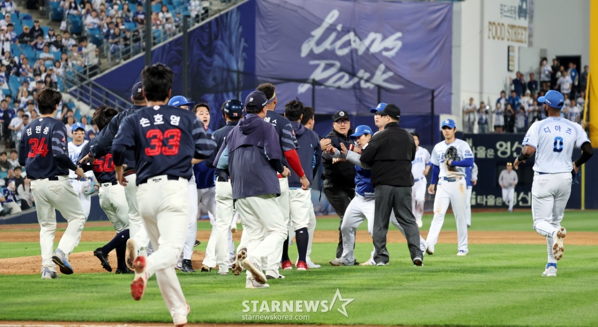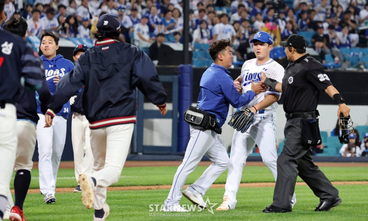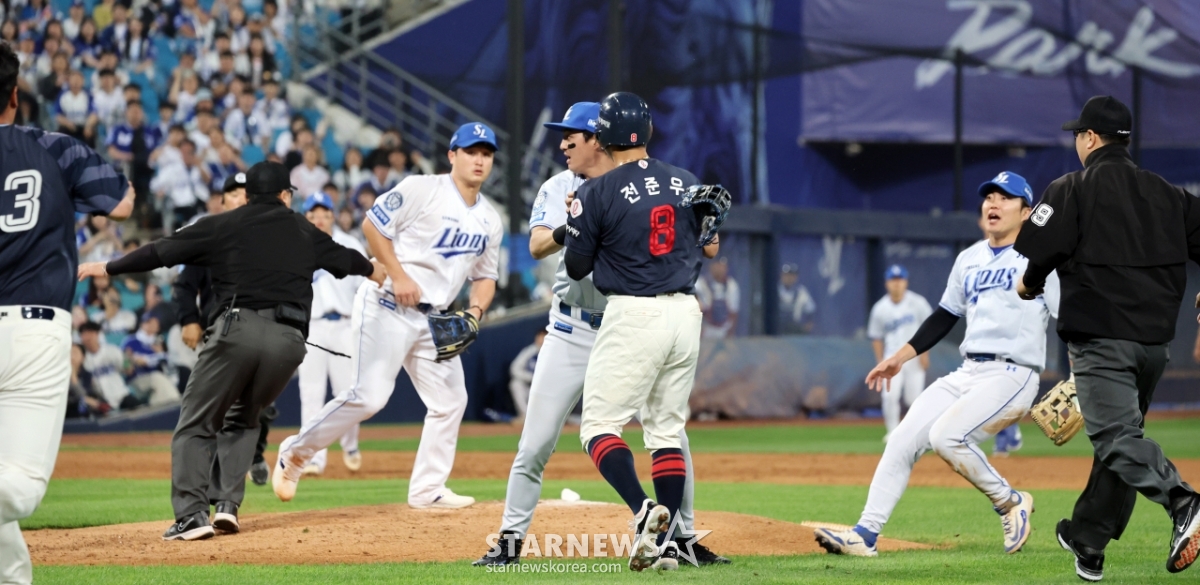 스포츠야구[★화보]전준우-최원태 충돌, 두번의 벤치클리어링발행 : 2025.05.29 ・ 20:15수정 : 2025.05.29 ・ 22:22대구=강영조 선임기자삼성 선발투수 최원태가 29일 대구삼성라이온즈파크에서 열린 2025 KBO리그 삼성라이온즈와 롯데자이언츠 경기 5회초 롯데 4번타자 전준우를 몸에 맞는 볼로 출루시키며 감정이 격화되며 벤치클리어링이 일어났다. 양팀 고참들의 중재로 잘마무리되는듯 하다 1루로 향하던 전준우와 최원태가 눈이 마주치며 2차 벤치클리어링이 발생했다. 결국 둘은 악수로 화해하며 감정을 녹여냈다.2025.05.29.<저작권자 © 스타뉴스, 무단전재 및 재배포 금지>브리핑요약 없이도 가볍게 읽으실 수 있는 짧은 뉴스입니다.추천 기사강영조 선임기자기자홈좋아요스포츠-야구의 인기 급상승 뉴스스포츠-야구의 최신 뉴스