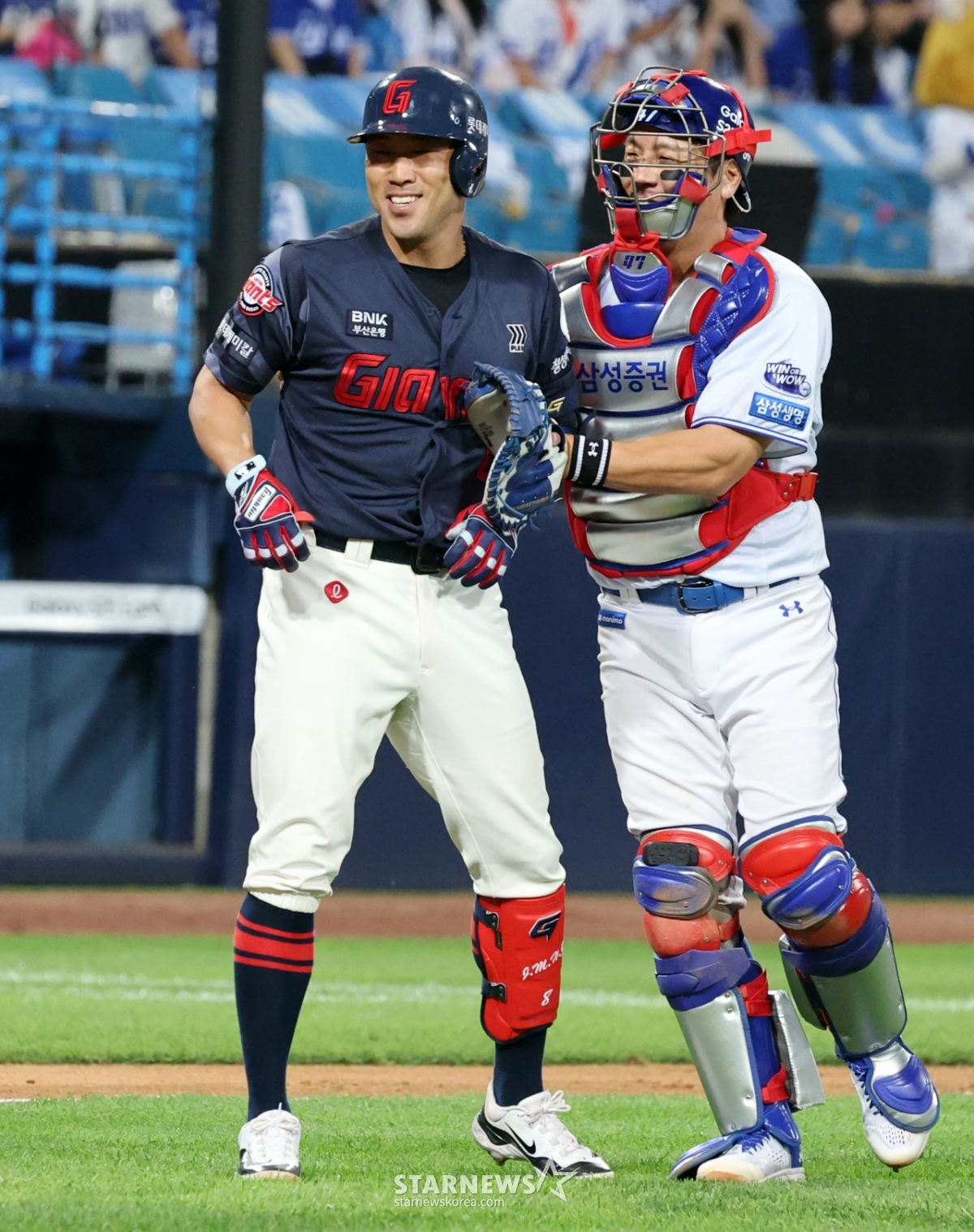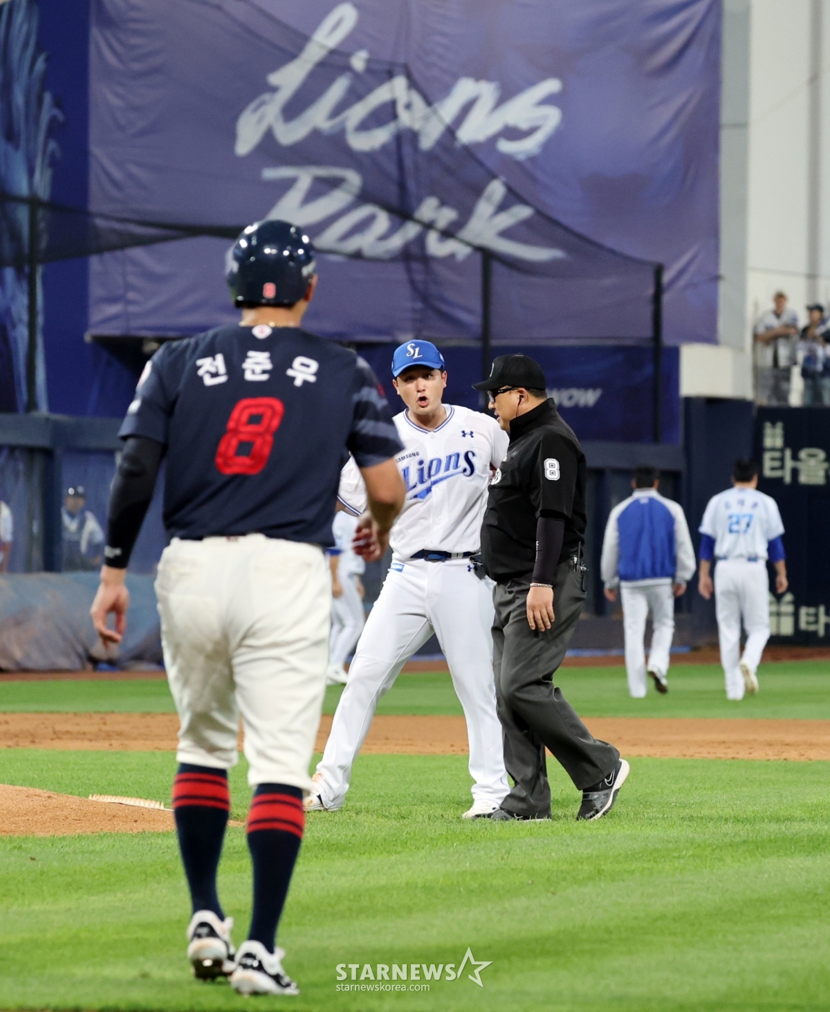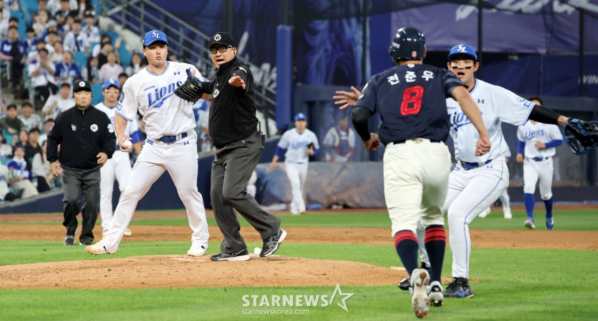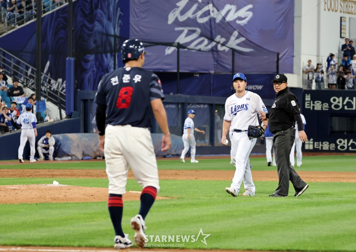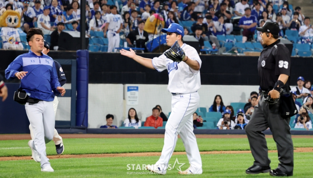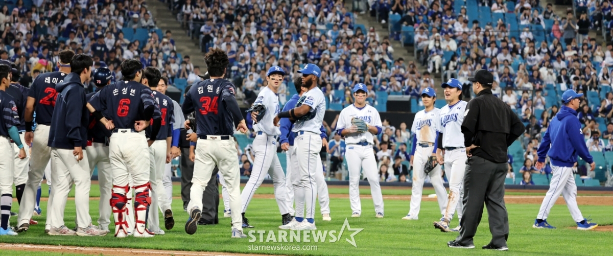 스포츠야구[★화보]전준우-최원태 충돌, 두번의 벤치클리어링발행 : 2025.05.29 ・ 20:15수정 : 2025.05.29 ・ 22:22대구=강영조 선임기자삼성 선발투수 최원태가 29일 대구삼성라이온즈파크에서 열린 2025 KBO리그 삼성라이온즈와 롯데자이언츠 경기 5회초 롯데 4번타자 전준우를 몸에 맞는 볼로 출루시키며 감정이 격화되며 벤치클리어링이 일어났다. 양팀 고참들의 중재로 잘마무리되는듯 하다 1루로 향하던 전준우와 최원태가 눈이 마주치며 2차 벤치클리어링이 발생했다. 결국 둘은 악수로 화해하며 감정을 녹여냈다.2025.05.29.<저작권자 © 스타뉴스, 무단전재 및 재배포 금지>브리핑요약 없이도 가볍게 읽으실 수 있는 짧은 뉴스입니다.추천 기사강영조 선임기자기자홈좋아요스포츠-야구의 인기 급상승 뉴스스포츠-야구의 최신 뉴스