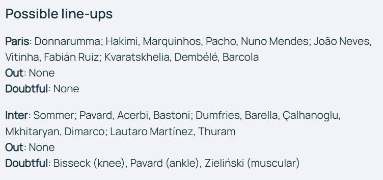 UEFA는 이날 PSG의 수비진은 누누 멘데스와 파초, 마르키뉴스, 아슈라프 하키미가, 골문은 잔루이지 돈나룸마가 지킬 것으로 봤다. 인터밀란의 경우 라우타로 마르티네스와 마르쿠스 튀랑이 투톱을 이루고 페데리코 디마르코와 헨리크 미키타리안, 하칸 찰하놀루, 니콜로 바렐라, 덴젤 둠프리스가 미드필드진을, 알레산드로 바스토니와 프란체스코 아체르비, 뱅자맹 파바르가 수비진을, 얀 조머가 골문을 각각 지킬 것으로 예상했다.