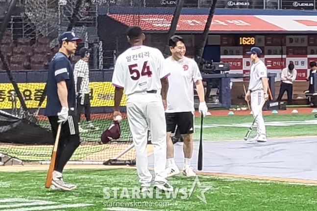 인터뷰를 마친 뒤엔 훈련 중인 양석환과 양의지, 김재환, 조인성 코치 등과 인사를 나누며 반갑게 대화를 나누기도 했다.