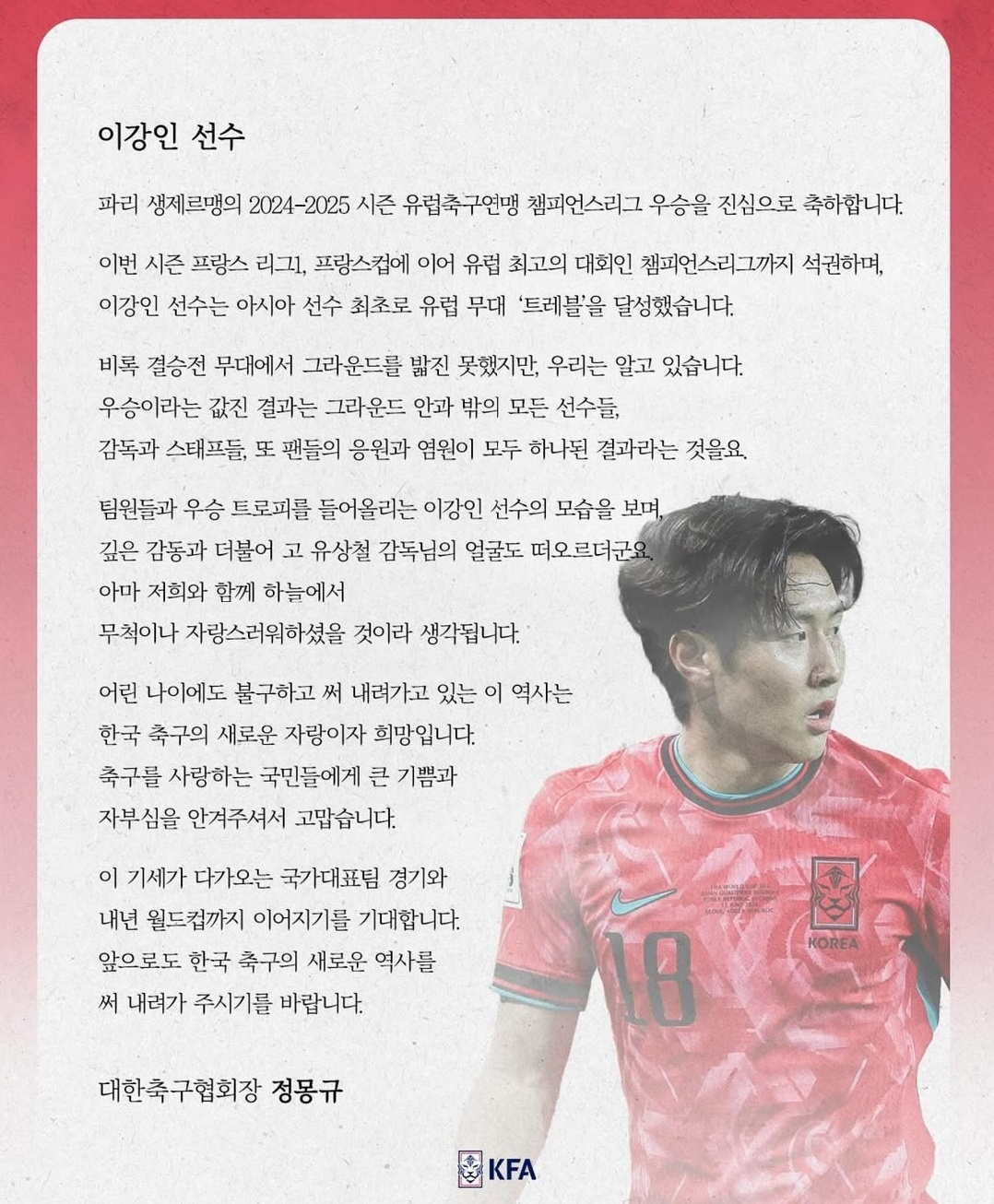 정몽규 회장은 1일 개인 사회관계망서비스(SNS)에 "파리 생제르망의 2024~2025시즌 유럽축구연맹(UEFA) 챔피언스리그(UCL) 우승을 진심으로 축하합니다"라며 "이강인 선수는 아시아 선수 최초로 유럽 무대 트레블을 달성했다. 프랑스 리그1과 프랑스컵(쿠프 드 프랑스)에 이어 유럽 최고의 대회인 챔피언스리그도 석권했다"고 게시글을 남겼다.