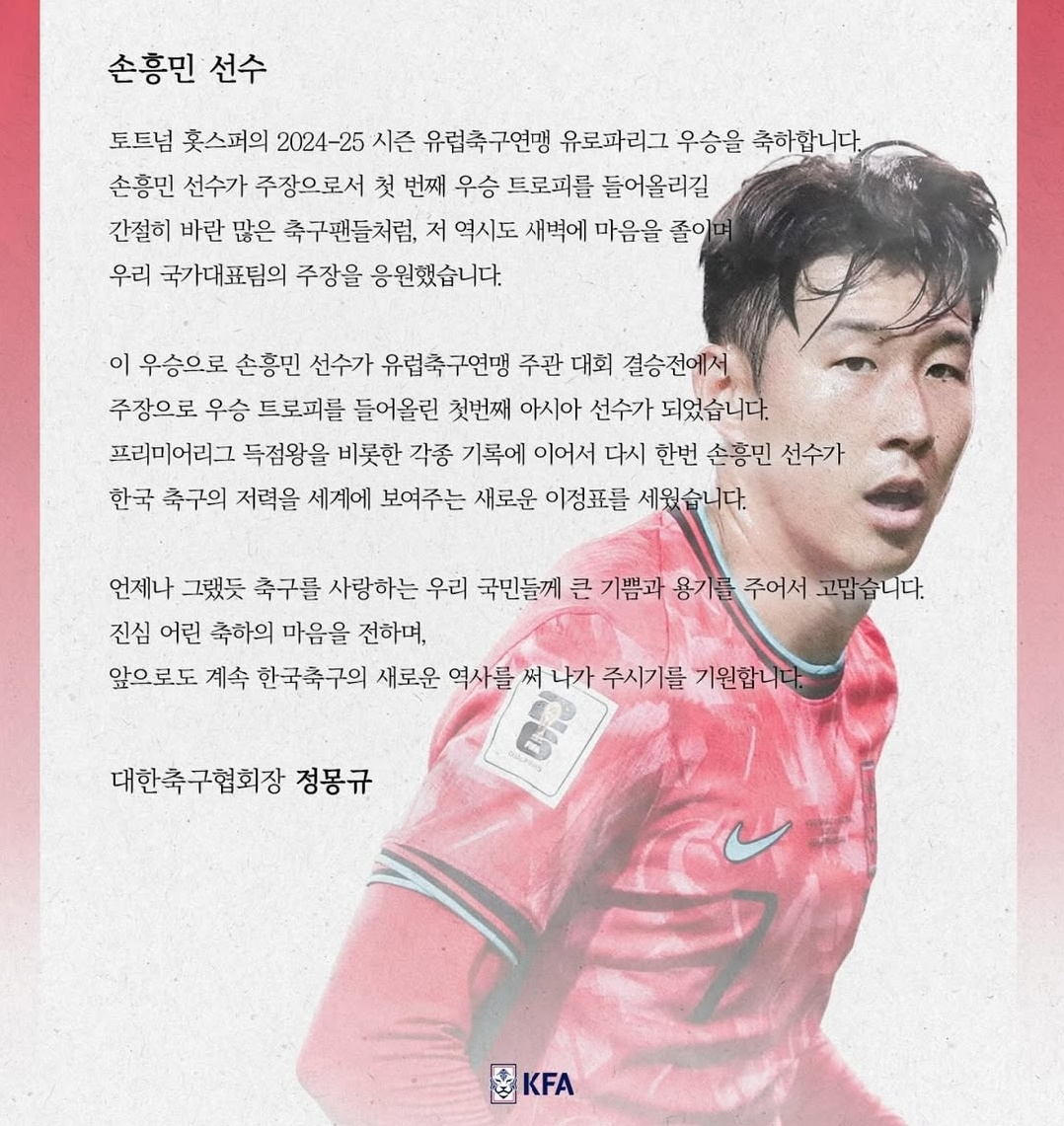앞서 정 회장은 2024~2025시즌 UEFA 유로파리그(UEL) 우승을 차지한 손흥민에게 축전을 남기기도 했다. 당시 정 회장은 "토트넘의 우승으로 손흥민 선수는 주장으로서 유럽 대항전 트로피를 든 첫 번째 아시아 선수가 됐다"며 "다시 한번 손흥민 선수가 한국 축구의 저력을 세계에 보여주는 새로운 이정표를 썼다"고 기뻐했다.