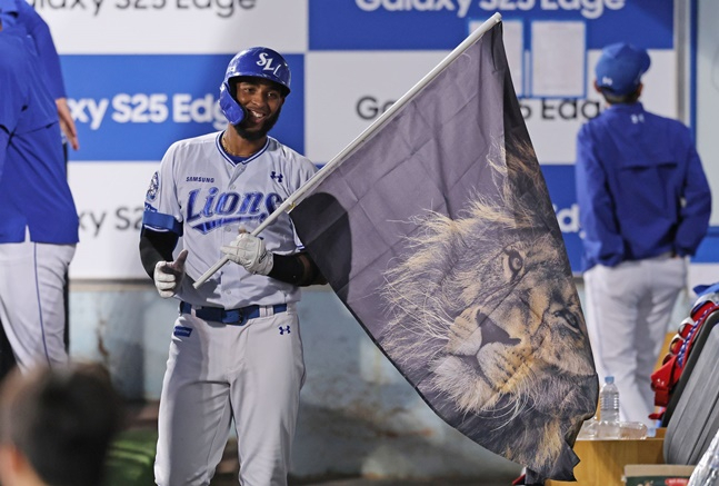 홈런임을 확인한 김태훈은 두 팔을 벌려 환호했다. 더그아웃 앞에서 주장 구자욱에게 사자가 그려진 깃발을 받아든 김태훈은 동료들과 역전의 기쁨을 나눴다.