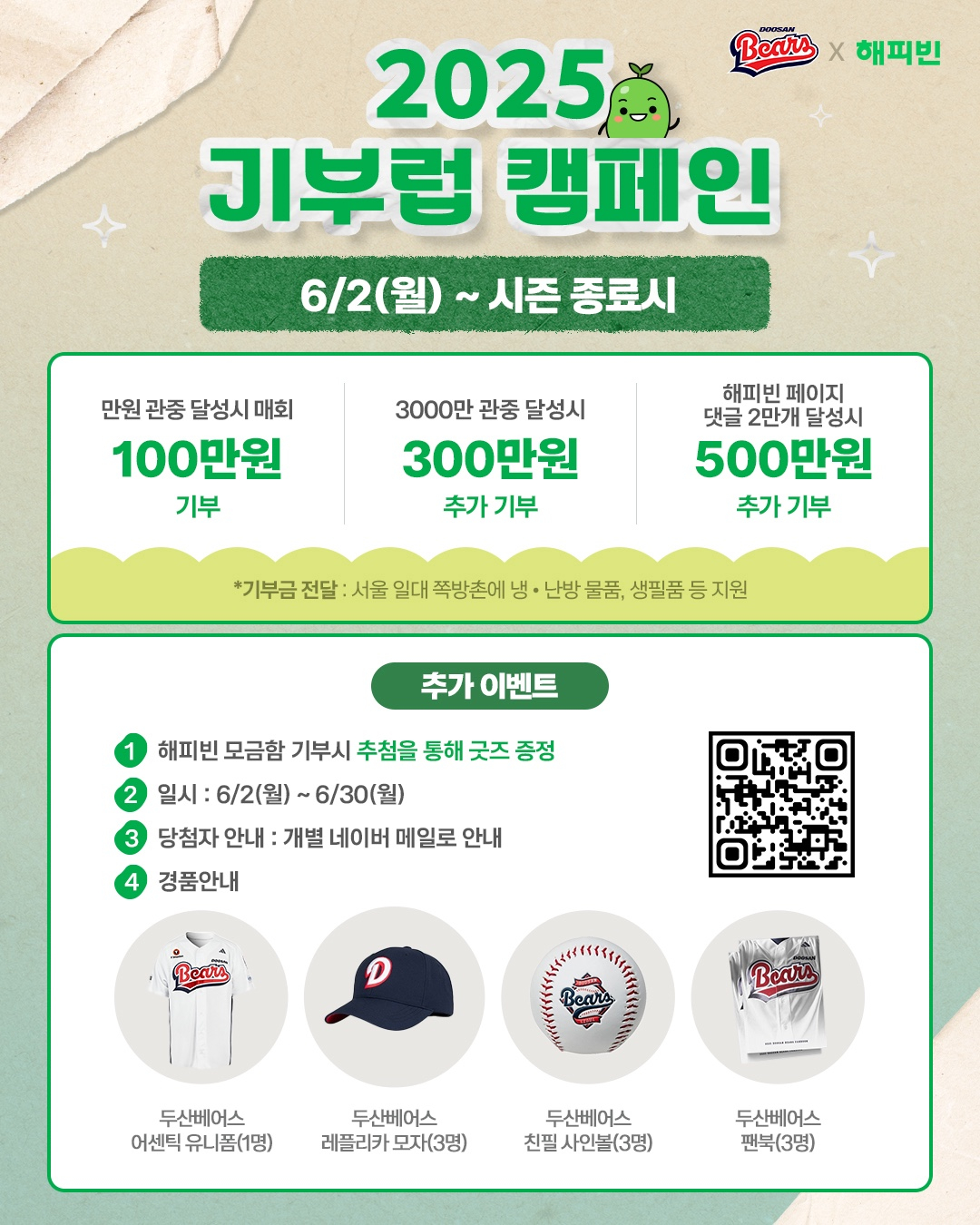 '기부럽 캠페인'은 두산 베어스와 네이버 해피빈이 2023년부터 함께 이어온 참여형 기부 캠페인이다. 올해로 3회째를 맞았다. 두산은 지난 2년간 학대 피해 아동, 소아암 환자 등을 지원한 데 이어 올해는 연고지 서울 일대 쪽방촌 주민을 위한 나눔에 나선다.