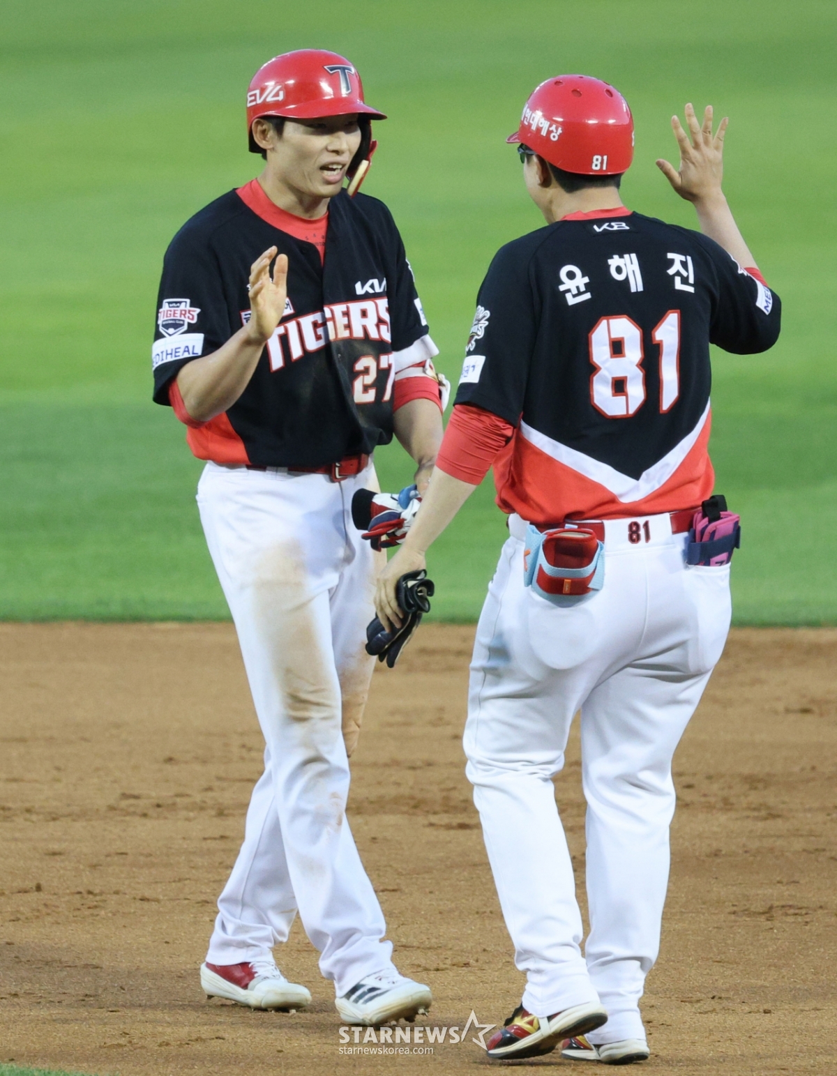 스포츠야구[포토] 김호령 '쐐기타 호령'발행 : 2025.06.03 ・ 19:47잠실=김진경 대기자광고삭제2025 신한 SOL Bank KBO리그 두산 베어스 대 KIA 타이거즈 경기가 3일 서울 잠실야구장에서 열렸다.KIA 김호령이 8회초 1사 2루에서 1타점 적시 2루타를 날리고 출루한 후 윤해진 코치의 환영을 받고 있다.<저작권자 © 스타뉴스, 무단전재 및 재배포 금지>프로야구KBO최강야구불꽃야구치어리더케이브추천 기사김진경 대기자기자홈좋아요 스포츠-야구의 인기 급상승 뉴스스포츠-야구의 최신 뉴스