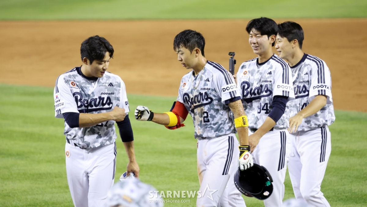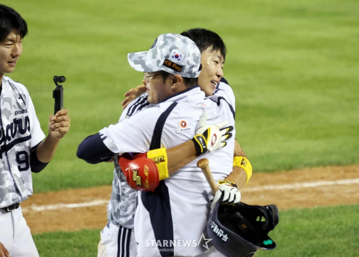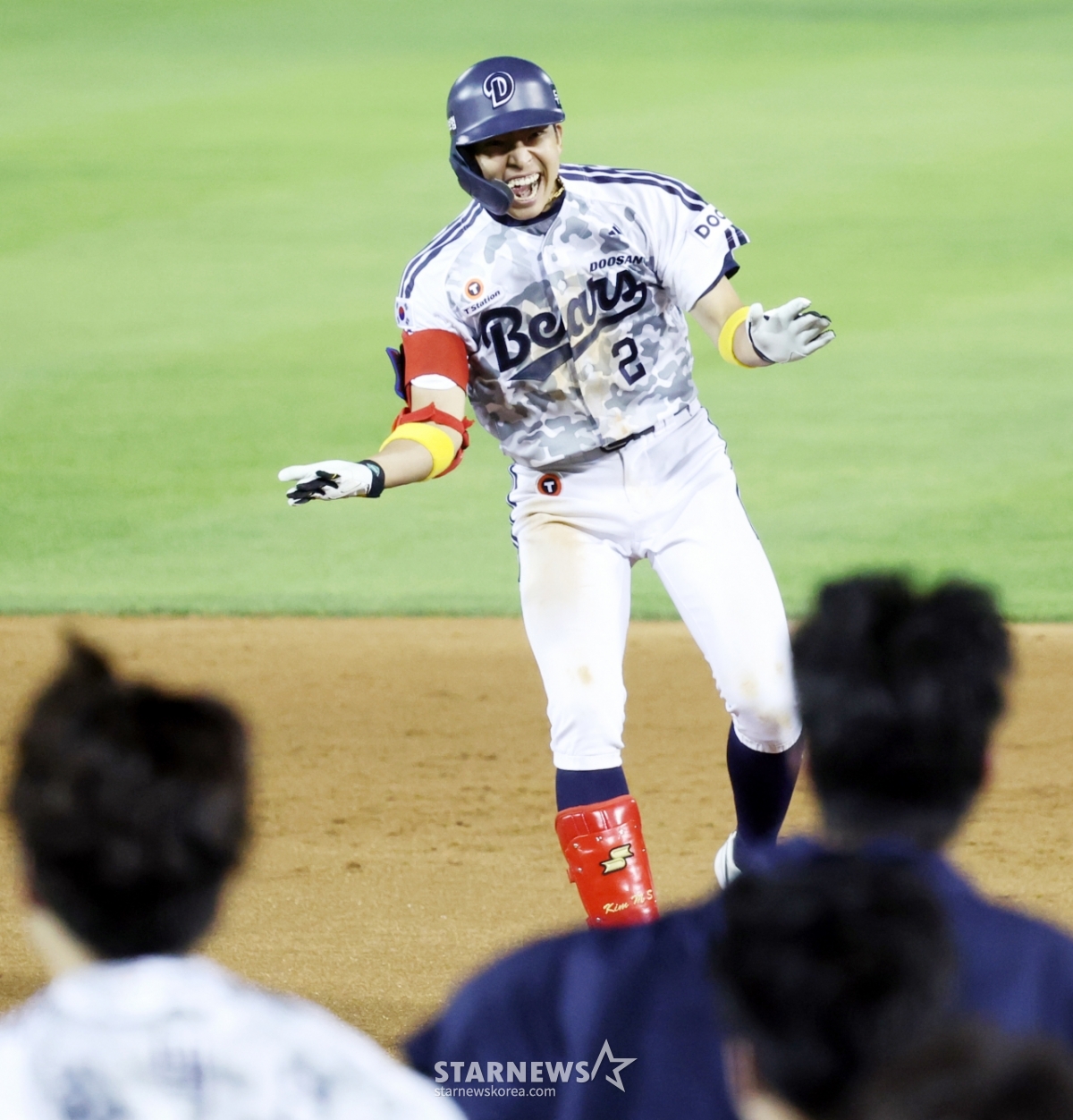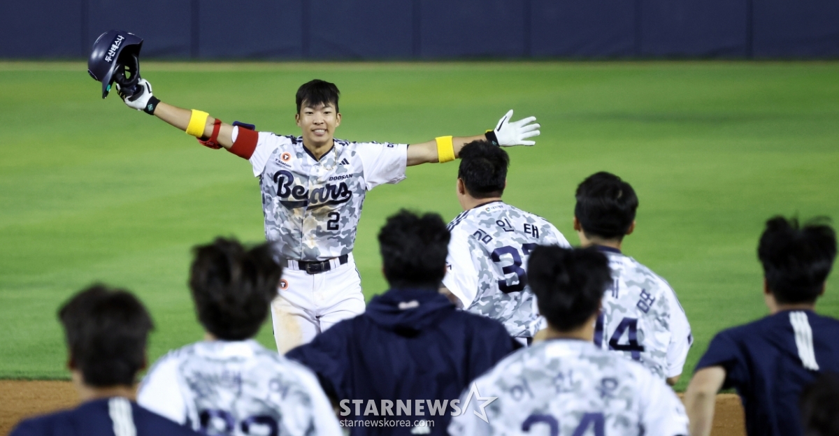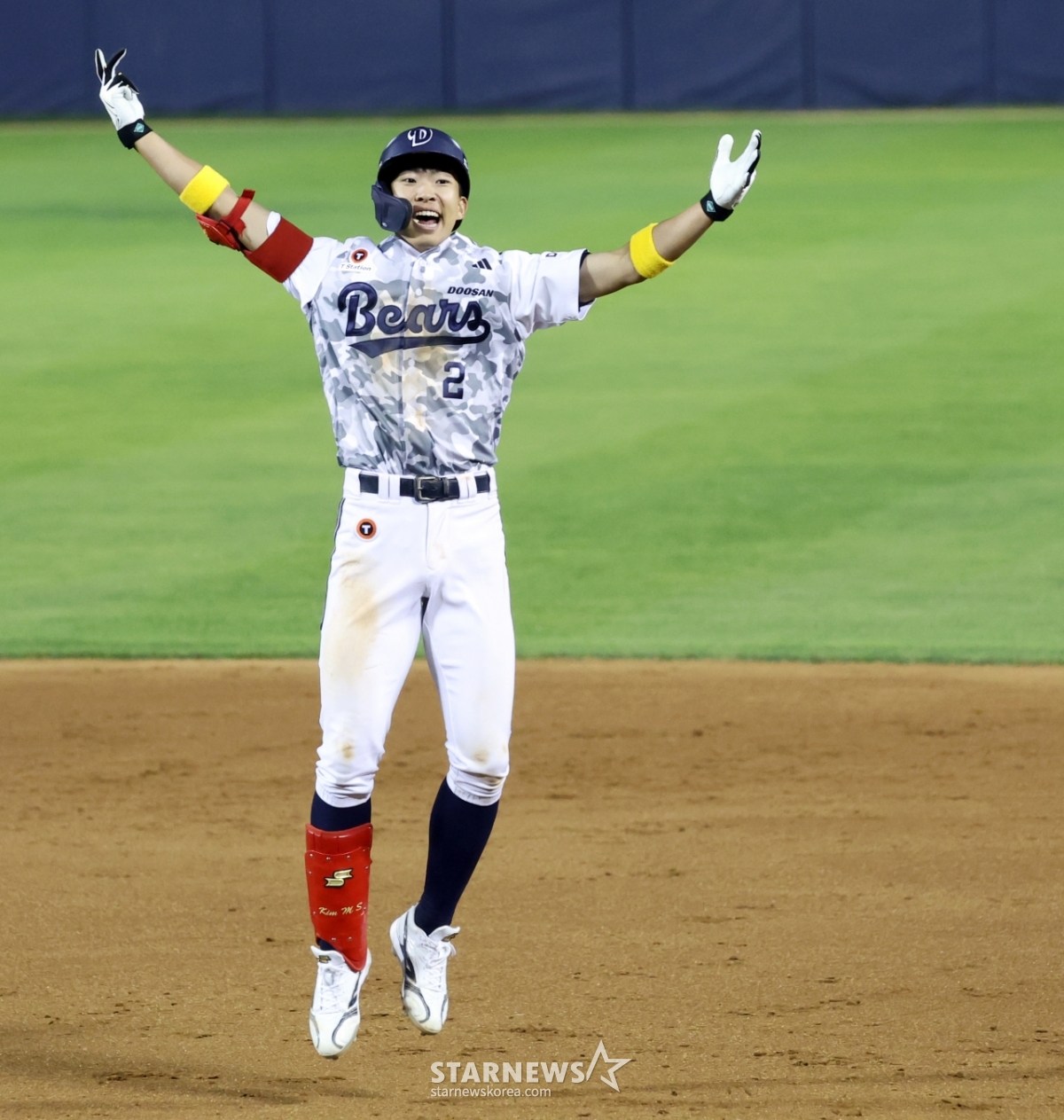 두사 5번타자 김민석이 5일 잠실구장에서 열리는 2025KBO리그 두산베어스와 KIA타이거즈 경기 10회말 2사 1,2루에서 끝내기 안타를 터트린 후 환호하고 있다. 2025.06.05.