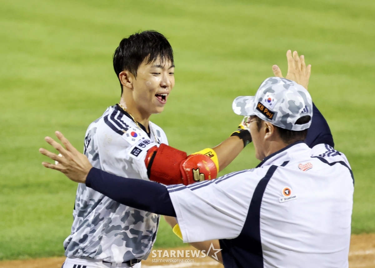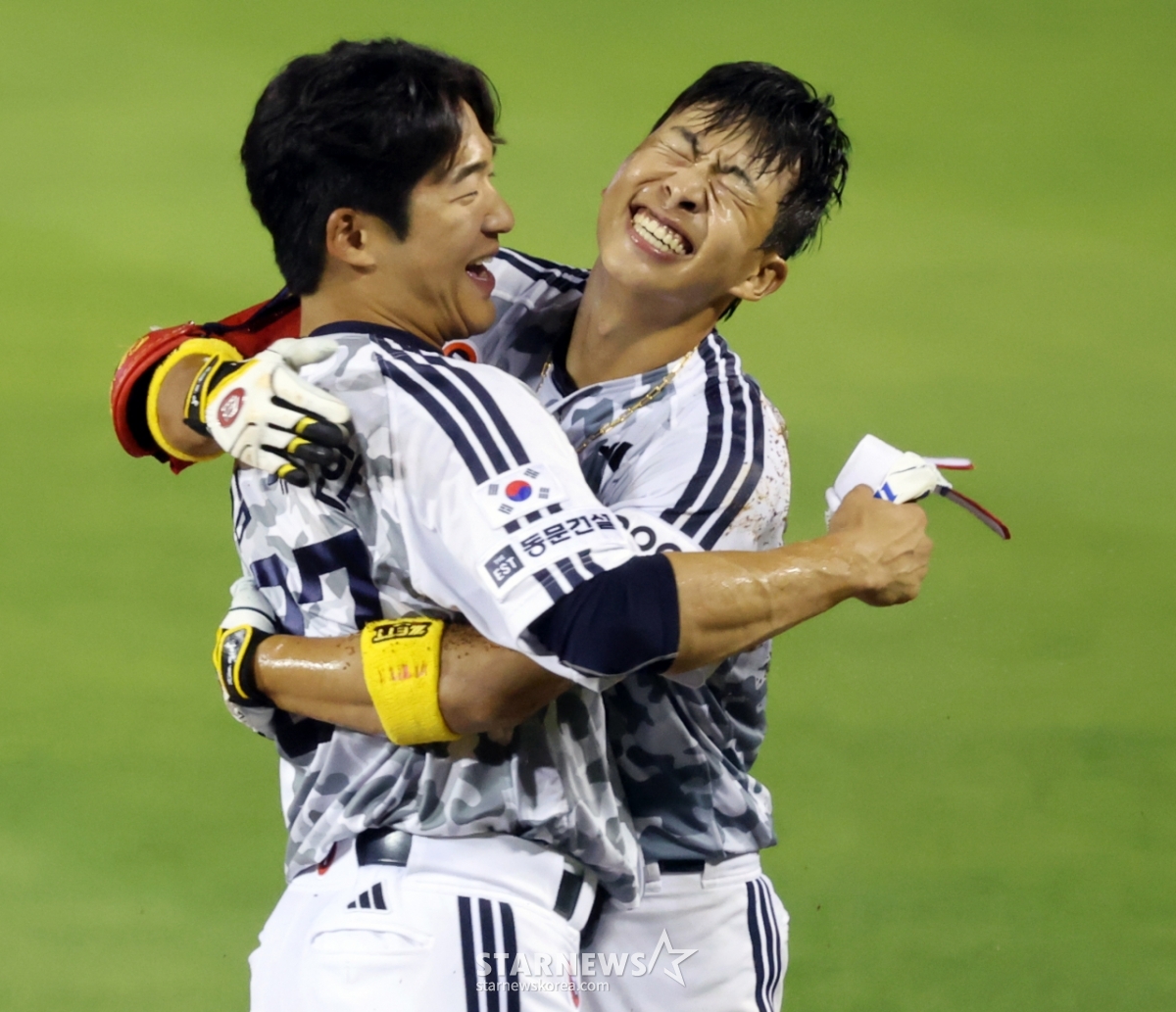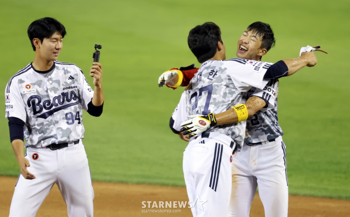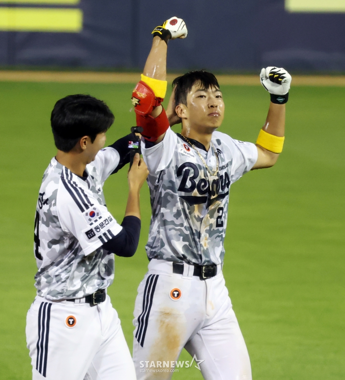 두사 5번타자 김민석이 5일 잠실구장에서 열리는 2025KBO리그 두산베어스와 KIA타이거즈 경기 10회말 2사 1,2루에서 끝내기 안타를 터트린 후 환호하고 있다. 2025.06.05.