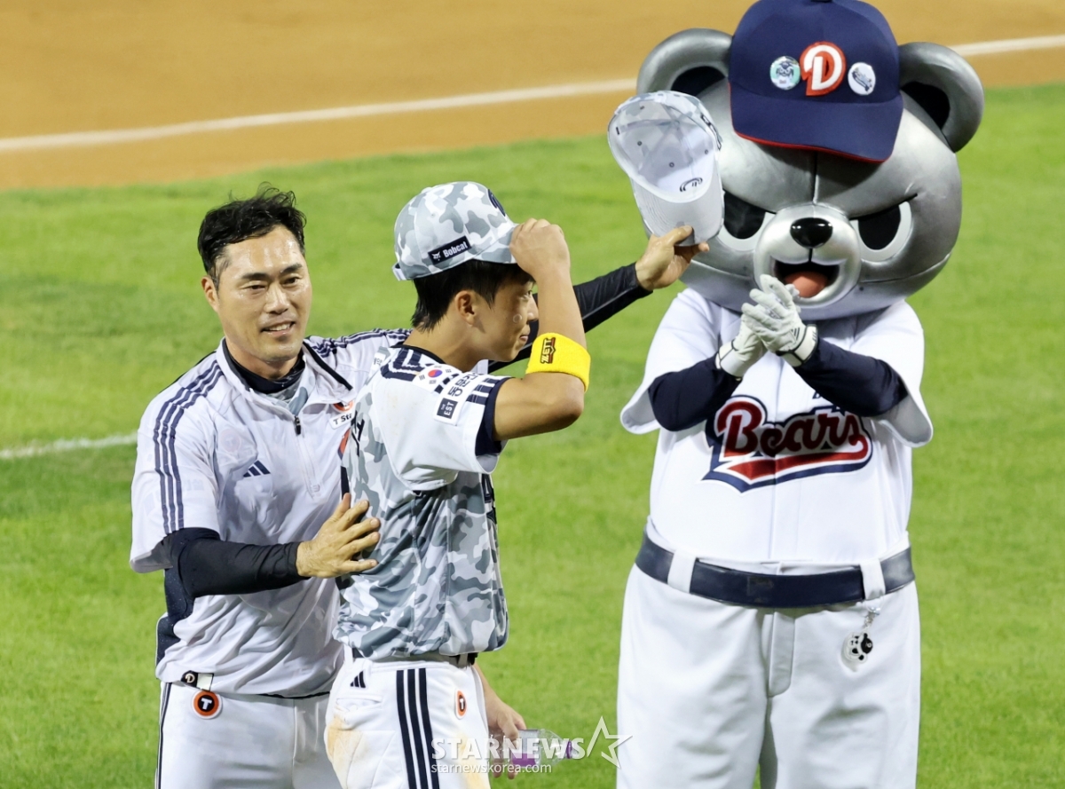 두산 5번타자 김민석이 5일 잠실구장에서 열리는 2025KBO리그 두산베어스와 KIA타이거즈 경기 10회말 2사 1,2루에서 끝내기 안타를 터트리며 두산이 승리했다. 김민석을 팬들에 인사시키는 조성환 감독대행. 2025.06.05.