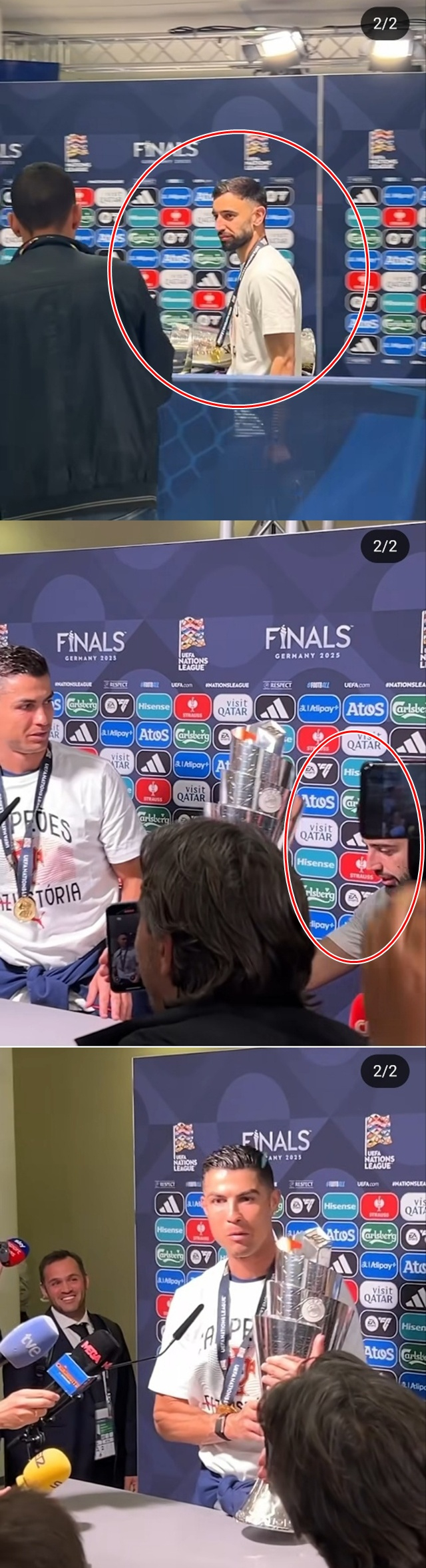경기 후에는 호날두 주위로 취재진이 몰려들었다. 호날두도 정신없이 우승 소감을 전했다. 그때 '맨유 후배' 페르난데스가 깜짝 등장했다. 저 멀리서 UNL 우승 트로피를 들고 오더니 인터뷰를 하고 있는 호날두 옆에 트로피를 올려두었다.