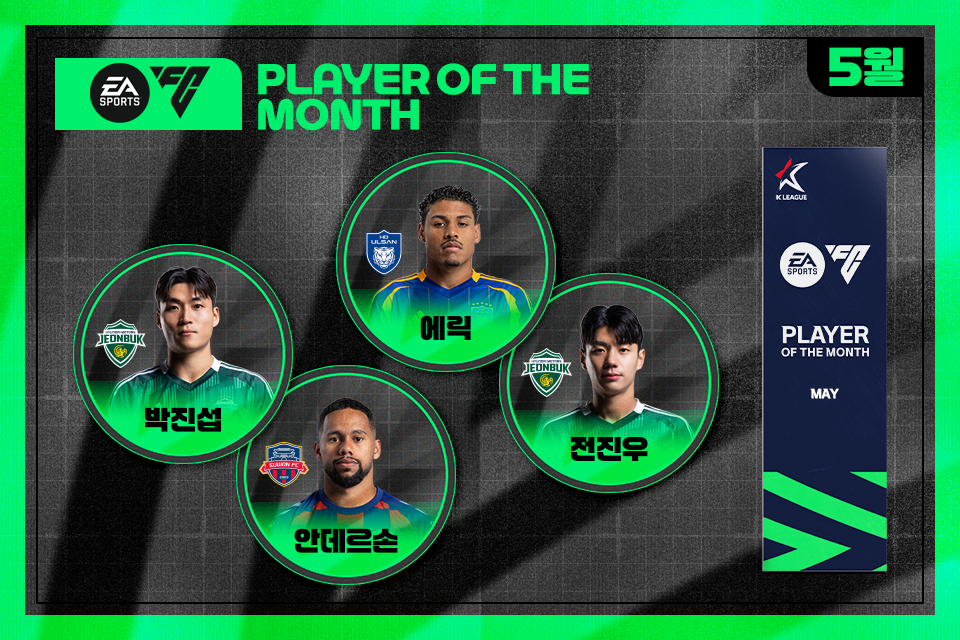 한국프로축구연맹이 2025시즌 프로축구 K리그1 5월 EA SPORTS 이달의선수상(EA SPORTS Player Of The Month) 주인공을 선정하는 팬 투표가 12일부터 15일까지 나흘간 실시된다고 11일 밝혔다.