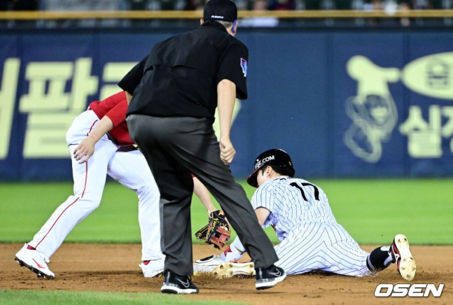 3-3으로 맞선 7회말 선두타자 박해민이 우전 안타로 출루했고 끊임없이 2루 도루를 노렸다. 계속된 견제에 박해민의 유니폼은 서서히 흙투성이가 됐다. 그리고 마침내 8번의 시도 끝에 2루를 훔쳤고, 계속해서 번트를 시도하던 신민재는 땅볼 타구로 박해민을 3루로 보냈다.