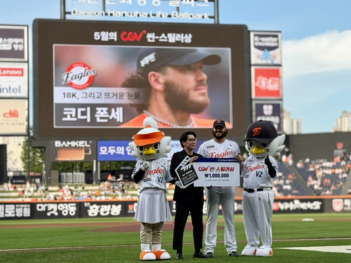 KBO와 CGV는 전날(11일) 대전 한화생명 볼파크에서 경기 전 시상식을 진행했다. CGV ICECON사업팀 김진호 팀장이 참석, 수상자인 폰세에게 상금 100만원을 비롯해 CGV 씨네드쉐프 무비&다이닝 패키지를 부상으로 수여했다.