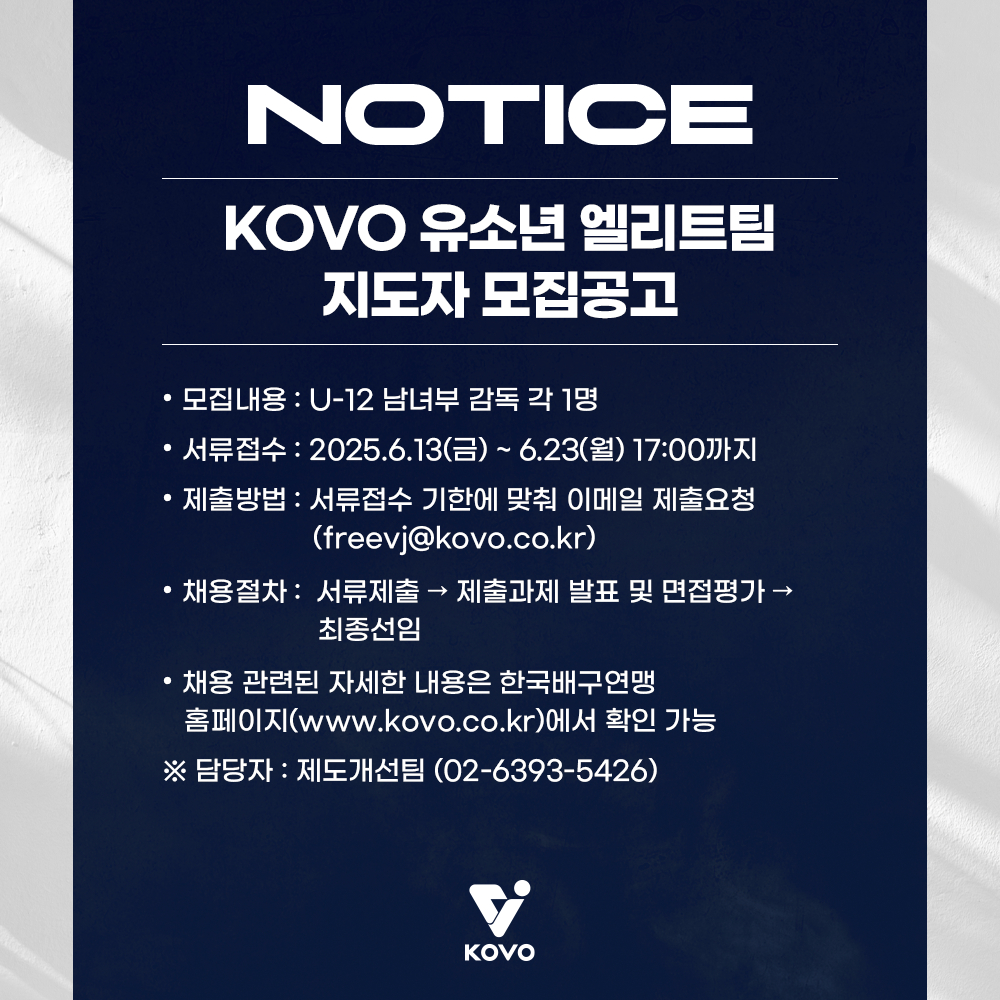 KOVO는 12일 보도자료를 통해 "오는 13일부터 23일 오후 5시까지 KOVO 유소년 엘리트팀 지도자를 모집한다"고 밝혔다.