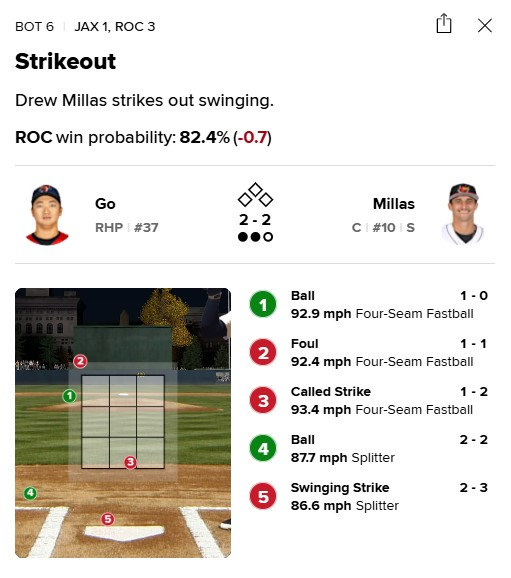 고우석은 팀이 1-3으로 뒤진 6회 2사 주자 없는 상황에서 마운드에 올랐다. 그는 첫 타자인 드류 밀라스를 상대로 2볼 2스트라이크에서 시속 86.6마일(약 139.4㎞)짜리 스위퍼를 던져 헛스윙 삼진으로 돌려세웠다.