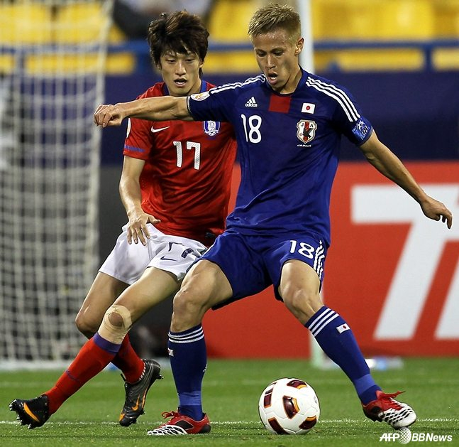 일본 국가대표 핵심으로 맹활약했던 혼다는 한국과 맞대결에서도 자주 출전해 한국 팬들에게도 익숙한 일본 레전드로 저명하다. 2011 아시아축구연맹(AFC) 아시안컵 4강에서는 한국과 경기서 풀타임을 뛰었다. 당시 혼다는 연장전 페널티킥을 실축했지만, 정성룡(현 가와사키 프론탈레)의 선방에 막힌 공을 호소가이 하지메가 밀어 넣으며 안도의 한숨을 쉬었다. 이 대회서 일본은 아시안컵 우승을 달성하며 최우수 선수(MVP)에 선정됐다.