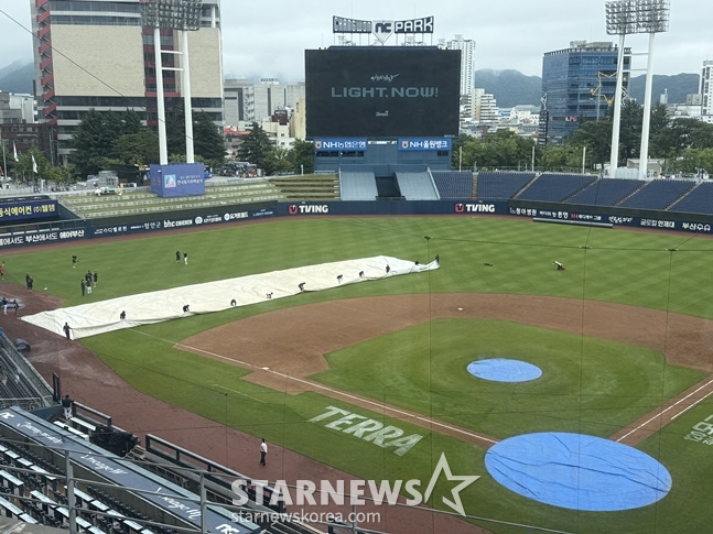 이후 창원 지역에는 밤새 많은 비가 쏟아졌고, 오후가 돼서도 부슬비가 내렸다. 하지만 조금씩 비가 잦아들면서 경기 진행에 대한 가능성이 생겼다. 결국 오후 3시가 넘어가면서 그라운드에 깔린 대형 방수포를 걷고 그라운드 정비에 나서고 있다.