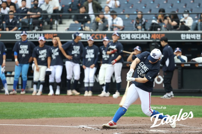 비거리만큼은 엄지민이 앞섰다. 우투좌타의 엄지민은 밀어치는 홈런은 물론이고 대전 한화생명 볼파크의 명물인 높이 8m의 몬스터 월도 두 차례 넘기는 장타력을 과시했다.