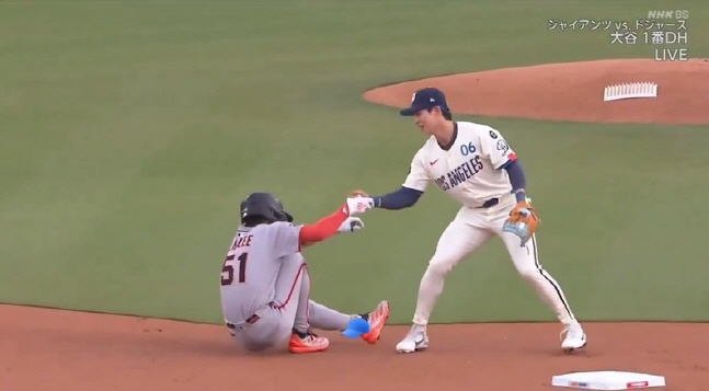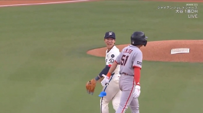 후속 타자의 병살타로 2루에서 물러났지만 이 과정에서 눈길을 사로잡는 장면이 연출됐다. 2루에서 슬라이딩을 한 뒤 아웃 판정으로 아쉬움에 쓰러진 이정후에게 김혜성이 다가섰고 손을 내밀어 일으켜 세워준 것이 일본 NHK 중계화면에 포착된 것. 김혜성과 이정후는 짧지만 서로를 향한 환한 미소를 보인 뒤 서로 더그아웃으로 향했다.