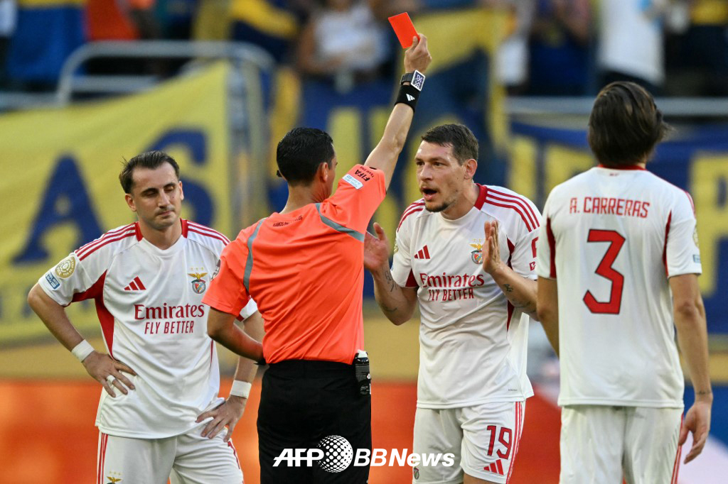 이어 후반 25분엔 반대로 벤피카에서 퇴장 선수가 나왔다. 바운드돼 높이 튀어 오른 공을 경합하는 과정에서 안드레아 벨로티가 발을 높게 들어 아리톤 코스타의 뒤통수를 가격했다. 코스타는 그대로 쓰러졌고, 주심은 비디오 판독(VAR)실과 교신 후 온 필드 리뷰를 거쳐 벨로티에게 레드카드를 꺼내 들었다.