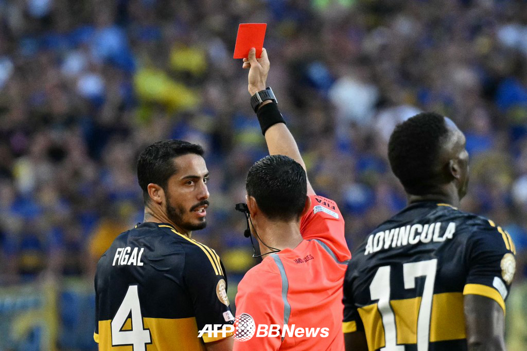 이날 경기의 첫 레드카드는 전반 막판에 나왔다. 상대의 거친 파울에 대한 주심의 페널티킥 판정에, 벤치에 있던 안데르 에레라(보카 주니어스)가 거칠게 항의하다 결국 레드카드를 받았다. 에레라는 이날 선발로 출전했다가 전반 20분 만에 부상으로 교체된 뒤 벤치에 앉아 있었는데, 결국 퇴장까지 당하는 불운이 겹쳤다.