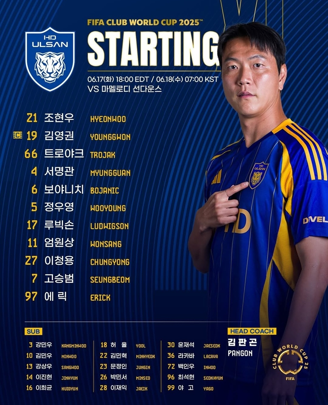 클럽월드컵 첫 경기에 나서는 울산HD의 스타팅이 공개됐다.