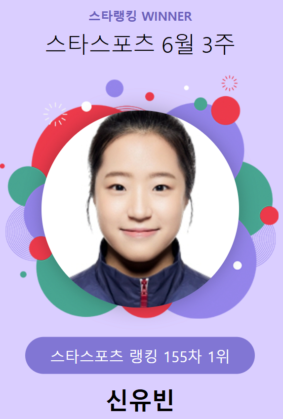 신유빈은 스타뉴스가 지난 12일 오후 3시 1분부터 19일 오후 3시까지 일주일 동안 진행한 스타랭킹 스타스포츠 155차(6월 3주) 투표에서 1만 2148표를 얻어 1위를 차지했다. 지난 150차(5월 2주) 투표에서 처음 선두에 오른 뒤 6주 연속 정상을 지켰다.