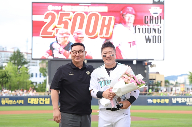 KIA 타이거즈가 외야수 최형우의 개인 통산 2500안타 달성을 비롯해 5월 MVP(최우수선수)로 뽑힌 정해영과 오선우의 시상식을 19일 KT 위즈전을 앞두고 개최했다.