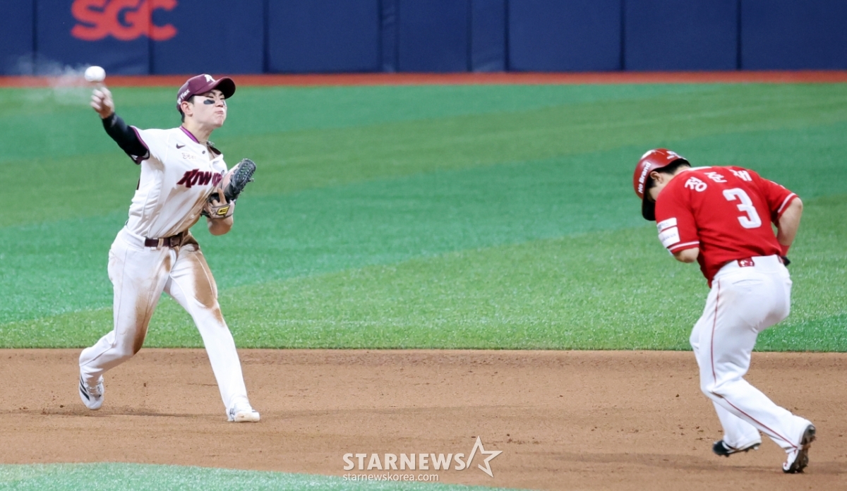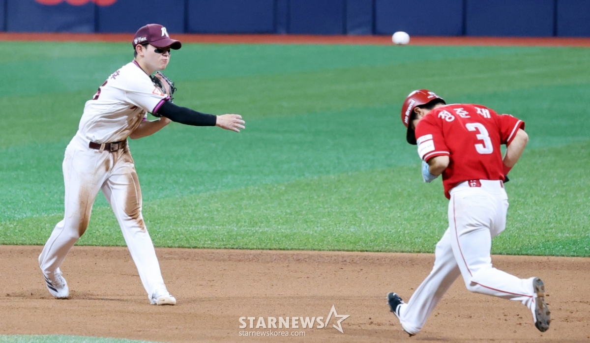 19일 고척스카이돔에서 열리는 2025 KBO리그 키움히어로즈와 SSG랜더스 경기 6회초 1사 만루에서 오태곤 내야땅볼 때 2루수 송지후가 1루주자 정준재를 2루포스아웃시킨후 1루로 송구해 병살처리하고 있다. 2025.06.19.