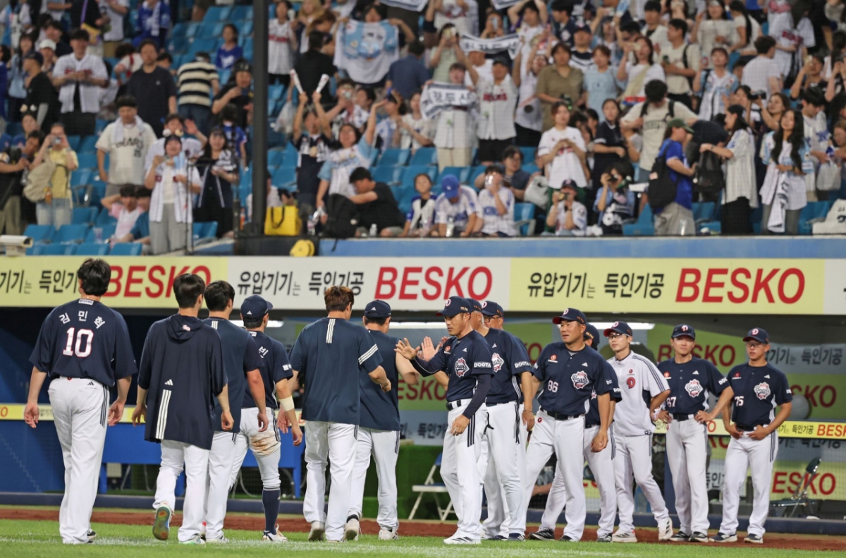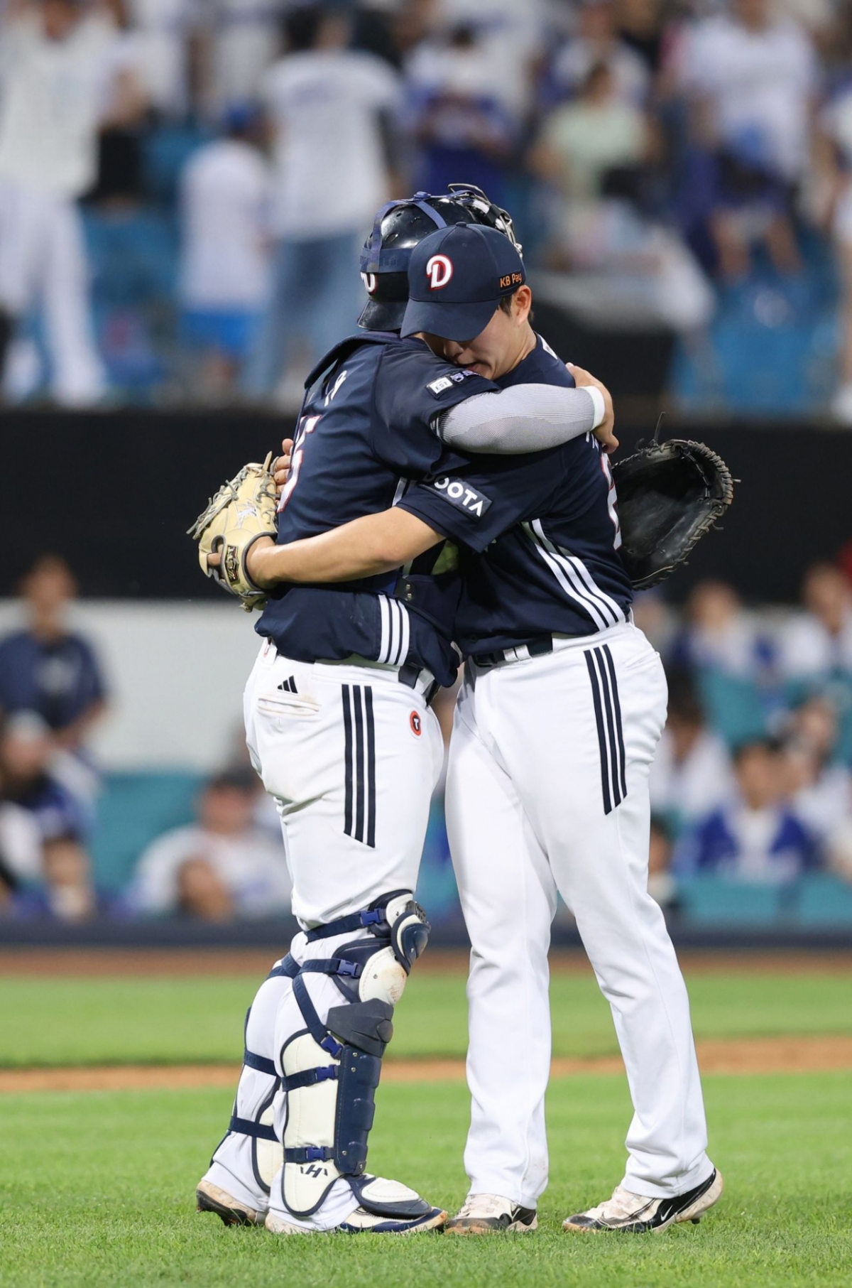 후속 대타 김인태가 볼넷으로 출루하며 만루 기회를 이어간 두산. 삼성도 여기서 포수를 김재성 대신 강민호로 바꾸는 승부수를 띄웠다. 결국 승자는 두산이었다. 다음 타자는 앞서 지쳐 있었던 양의지를 대신해 교체로 들어온 김기연. 김기연은 풀카운트 끝에 배찬승의 6구째 높은 존에 걸친 속구(149km)를 공략, 2타점 우중간 적시타를 터트리며 영웅으로 등극했다. 9-8 역전. 결국 두산은 8회말 박치국, 9회말 김택연을 각각 올린 끝에 승리를 거머쥐었다. 김택연은 선두타자 구자욱에게 안타, 1사 후 양도근과 전병우에게 연속 볼넷을 내주며 만루 위기까지 몰렸지만, 김영웅을 3루수 인필드 플라이 아웃, 류지혁을 중견수 뜬공으로 각각 처리하며 안도의 한숨과 함께 극적 승리에 마침표를 찍었다. 18일 블론세이브와 함께 패전의 멍에를 썼던 김택연은 마음고생을 심하게 하기라도 한 듯 김기연과 묵직한 포옹을 나눴다.