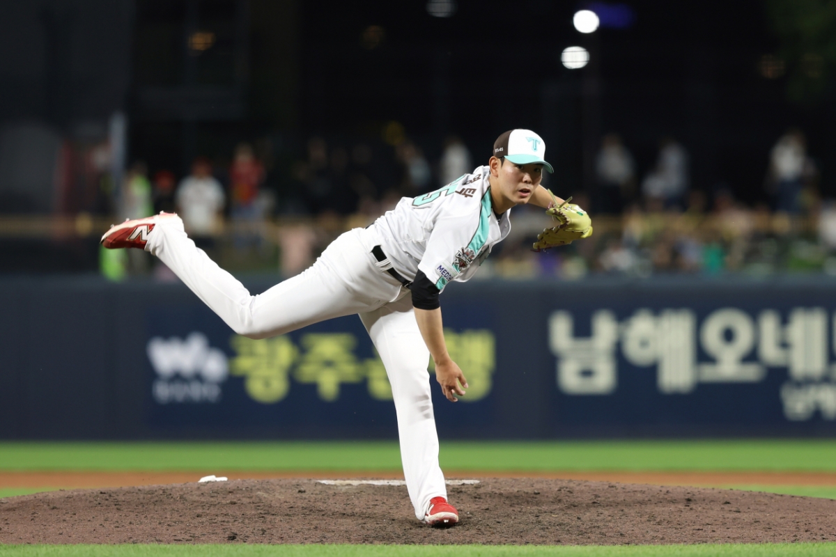 성영탁은 팀이 5-0으로 앞서고 있는 8회 팀의 세 번째 투수로 마운드를 밟았다. 성영탁은 마운드에 오르자마자 선두타자 안현민을 2구째 커브를 뿌리며 중견수 뜬공으로 잡아냈다.