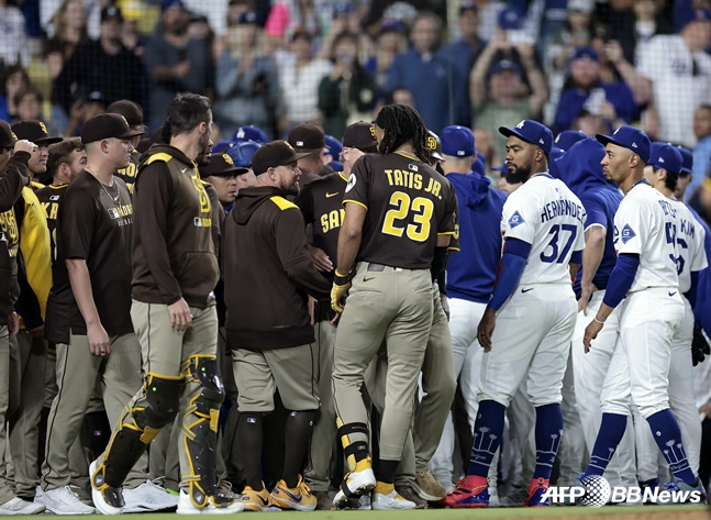 LA 다저스와 샌디에이고 파드리스가 맞붙은 20일(한국시간) 미국 캘리포니아주 로스엔젤레스 다저스타디움. 경기 막판 승부 이상으로 구장을 달아오르게 만든 게 있었으니 바로 벤치 클리어링이었다.