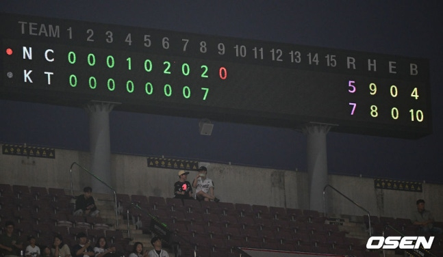 KT 마무리 박영현도 9회초 2사에서 권희동에게 좌중간 2루타, 박민우에게 우전 안타를 맞아 분위기에 휩쓸리는 듯했다. 그러나 손아섭을 공 5개로 투수 앞 땅볼로 직접 처리하며 기나긴 경기에 마침표를 찍었다.