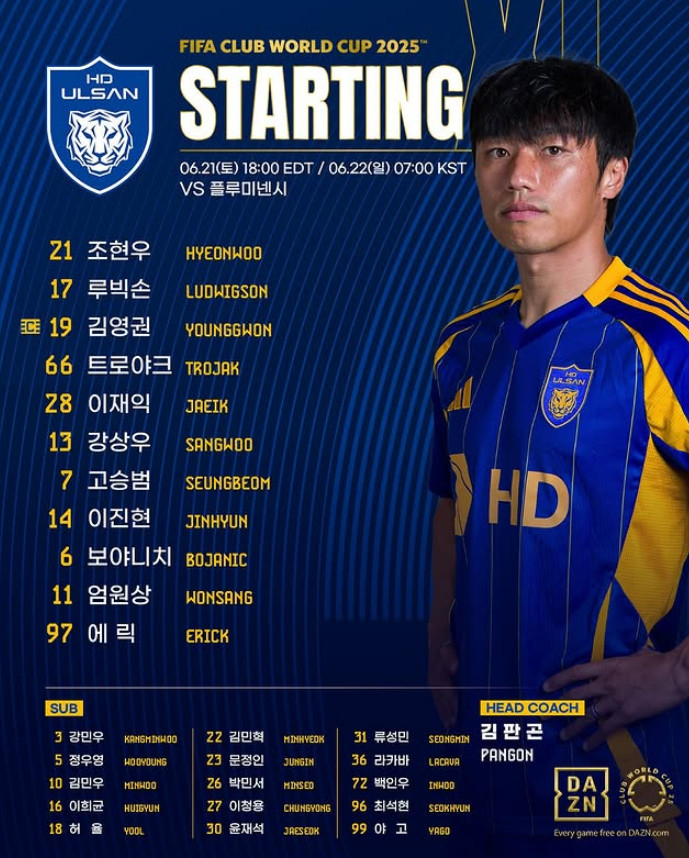 울산은 22일 오전 7시(한국시간) 미국 뉴저지주 이스트 러더퍼드의 메트라이프 스타디움에서 열린 플루미넨시(브라질)와의 '2025 국제축구연맹(FIFA) 클럽 월드컵' 조별리그 F조 2차전에서 2-4로 패했다.