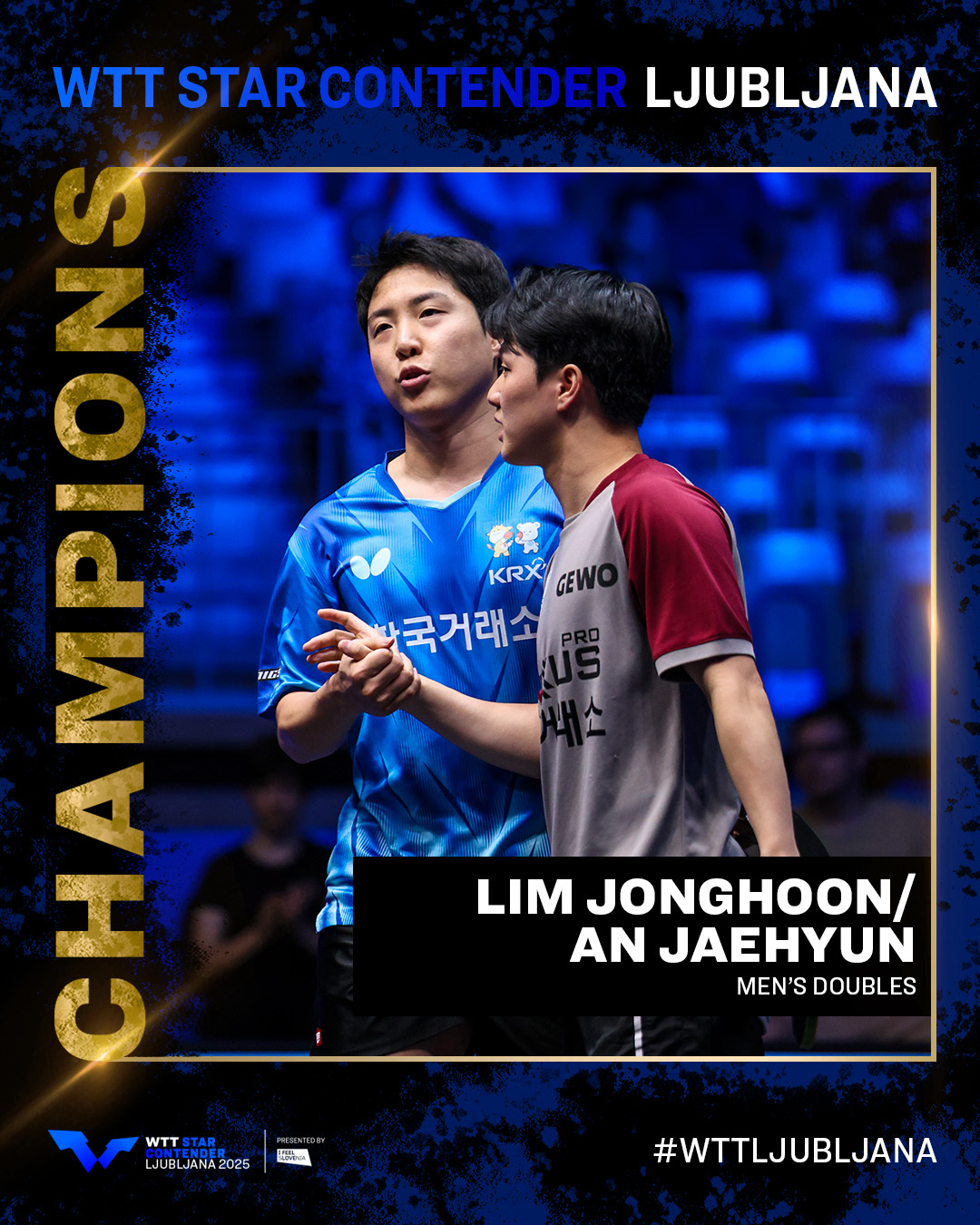 세계 랭킹 9위 임종훈-안재현 조는 22일(한국시간) 슬로베니아 류블랴나에서 열린 월드테이블테니스(WTT) 스타 컨텐더 류블라냐 2025 결승에서 세계 1위 펠리스 르브렁-알렉시스 르브렁(프랑스) 조를 3-0(11-9, 11-9, 12-10)으로 꺾었다.