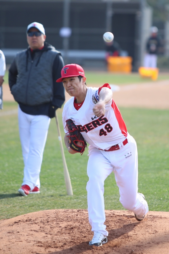 이날 이의리의 총 투구 수는 39개였다. KIA 구단 관계자에 따르면 등판을 마친 뒤 불펜에서 15개의 공을 추가로 던졌다. 1회 선두타자 이한별에게 볼넷을 허용한 이의리. 하지만 전다민과 박계범, 그리고 김대한을 모두 삼진으로 잡아내는 위력투를 보여줬다.