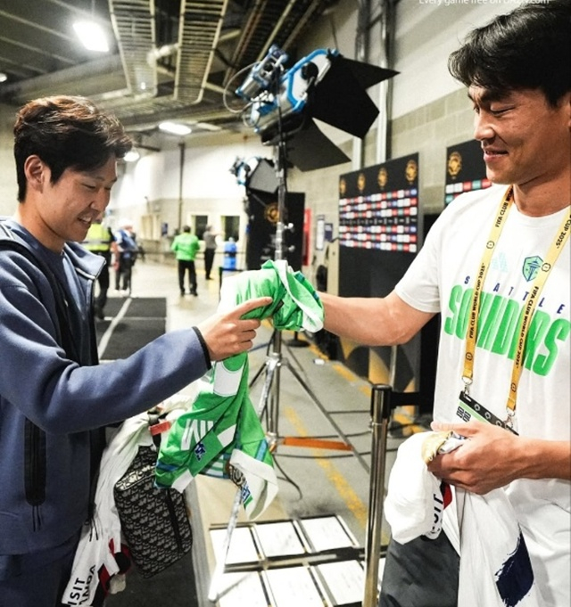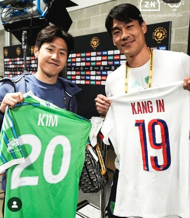 김기희의 소속팀 시애틀 사운더스(미국)는 25일(한국시간) 김기희와 이강인이 유니폼을 교환하는 장면을 소개했다. 김기희는 시애틀의 초록색 유니폼, 이강인은 파리 생제르맹(PSG)의 흰색 유니폼을 서로에게 건넸다. 둘은 유니폼을 들고 미소를 지으며 포즈를 취했다.