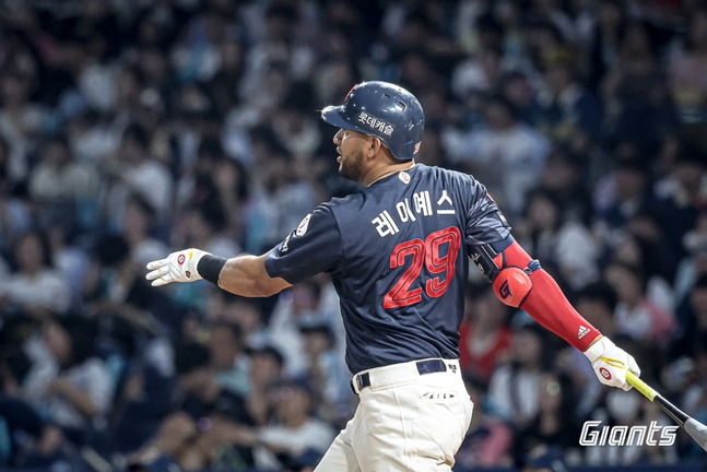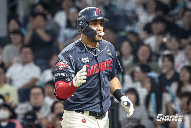 이어 5회에는 대포를 통해 빅이닝의 서막을 알렸다. 이닝 선두타자로 나선 레이예스는 NC 투수 이준혁의 2구째 몸쪽 패스트볼을 공략했다. 계속 날아간 타구는 오른쪽 담장을 넘어가는 솔로홈런이 됐다. 시즌 개인 9호 홈런이었고, 비거리는 125m가 기록됐다.