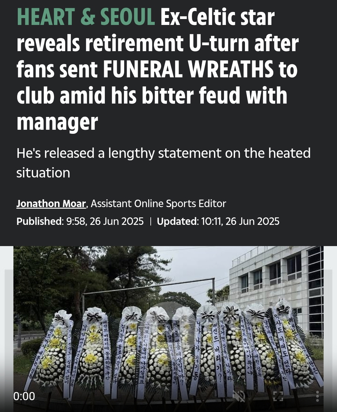 영국 '더선'은 27일(한국시간) "전 셀틱 스타(기성용)가 감독과 불화로 팀을 나갔다. FC서울 팬들은 근조 화환 시위를 펼쳤다"고 보도했다.