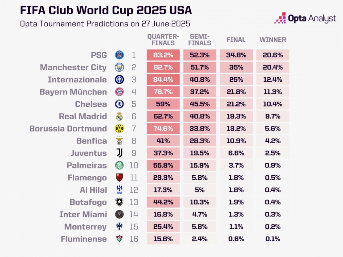 축구 통계 업체 옵타가 슈퍼컴퓨터 시뮬레이션을 거쳐 28일 공개한 2025 FIFA 클럽 월드컵 우승 가능성에 따르면 PSG는 20.6%를 기록, 16개 팀 가운데 1위에 올랐다.