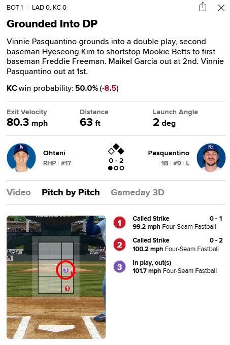 김혜성이 오타니의 도우미로 나섰다. 비니 파스콴티노가 타석에 섰고 오타니는 힘으로 밀어붙였다. 1구 99.2마일(159.6㎞), 2구 100.2마일(161.3㎞)의 빠른 공으로 0-2가 됐고 3구는 무려 101.7마일(163.7㎞) 포심을 뿌렸다. 파스콴티노가 방망이를 휘둘렀으나 타구는 2루수 김혜성에게 향했다. 김혜성은 유격수에게 공을 뿌렸고 여유 있는 병살 플레이로 이닝을 실점 없이 마칠 수 있었다.