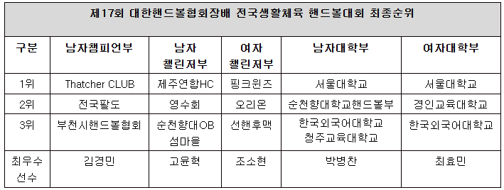 대한핸드볼협회가 주최한 '제17회 대한핸드볼협회장배 전국생활체육 핸드볼대회'가 지난 28~29일 서울 올림픽공원 핸드볼경기장에서 이틀간의 열전을 펼쳤다.