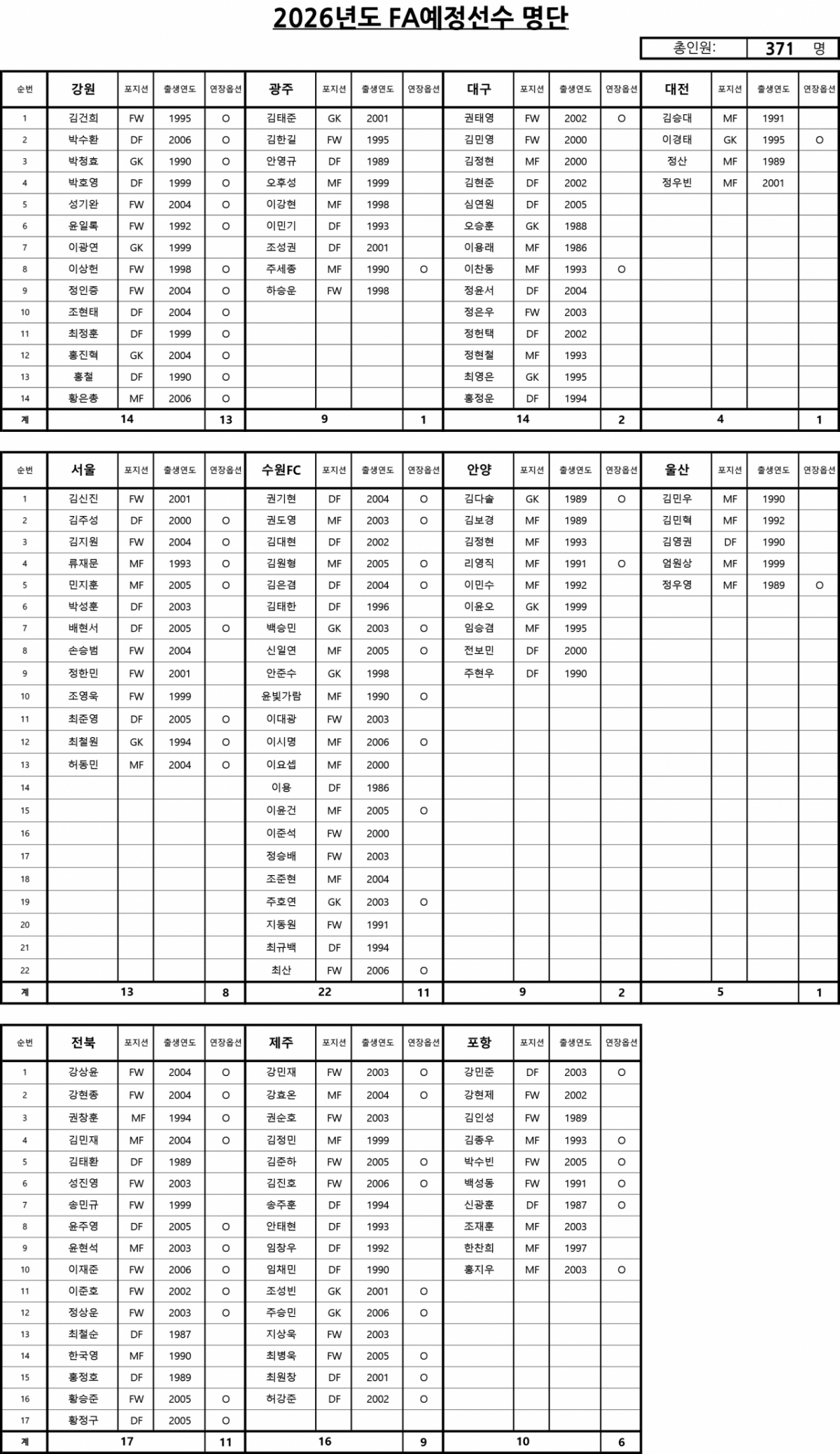 공시 대상 선수는 총 371명이다. 이 중 2005년 이후 K리그에 최초 등록한 370명은 올해 12월 31일 계약 기간이 만료됨으로써 FA자격을 취득한다. FA자격 취득 후에는 타 구단과 자유롭게 선수계약을 할 수 있다. 단, 계약 기간 만료 전 현재 소속 구단과 재계약을 체결하는 경우에는 FA자격을 취득하지 않는다.