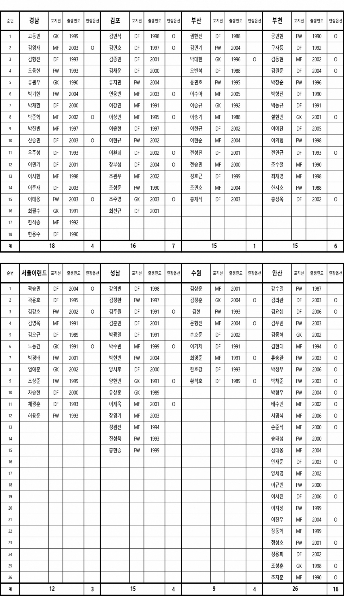 - K리그2 : 경남 18명, 김포 16명, 부산 15명, 부천 15명, 서울E 12명, 성남 15명, 수원 9명, 안산 26명, 인천 12명, 전남 11명, 천안 29명, 충남아산 20명, 충북청주 17명, 화성 22명 (총 237명)