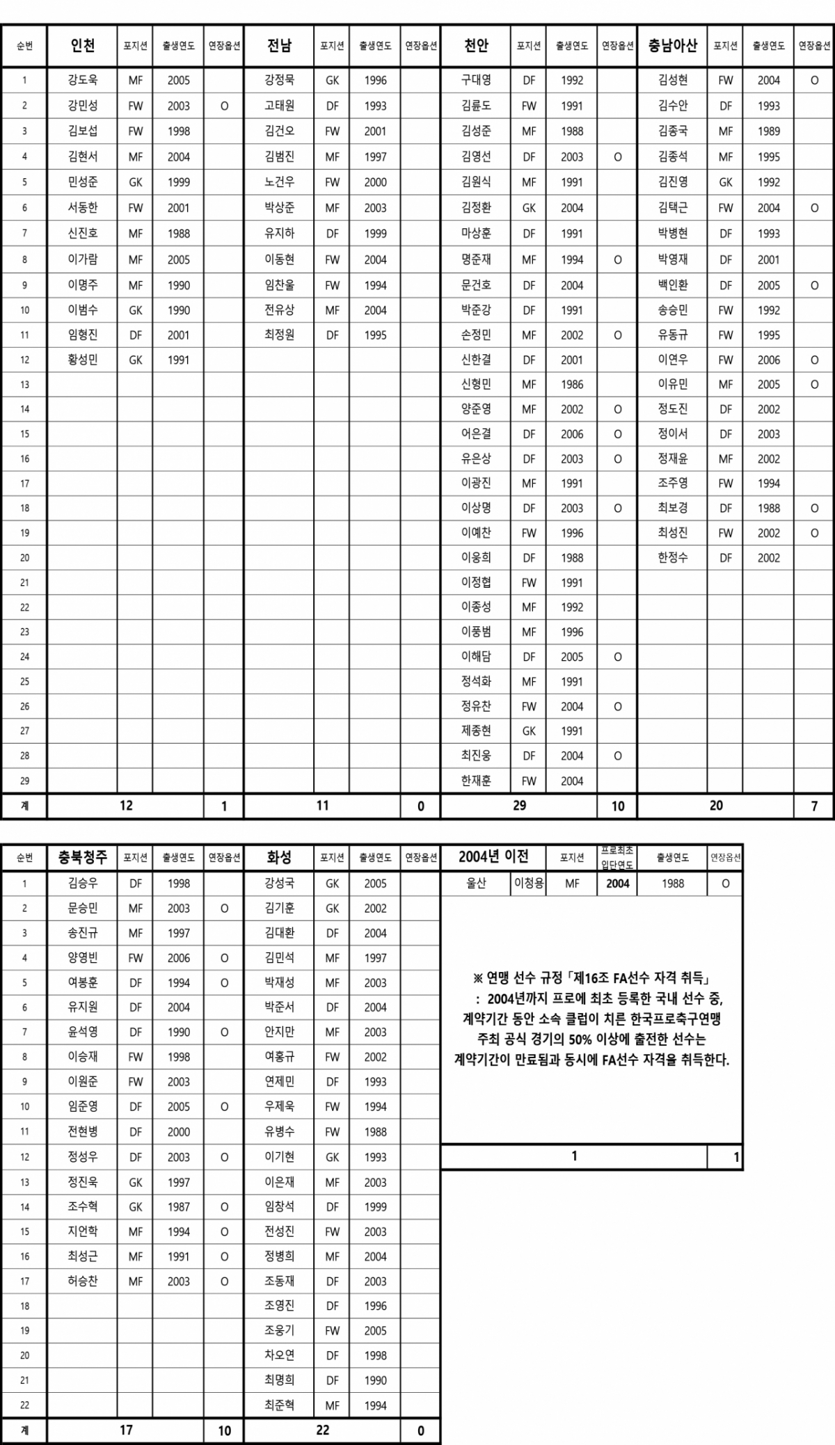 2004년 이전에 K리그에 첫 등록한 선수는 당시 규정에 따라 계약 기간 동안 소속팀이 치른 공식경기의 50% 이상 출장할 경우 계약 기간 만료와 동시에 FA자격을 얻는다. 이번 공시 대상 선수 중 2004년 이전 K리그에 첫 등록한 선수는 이청용(울산)이 유일하다.