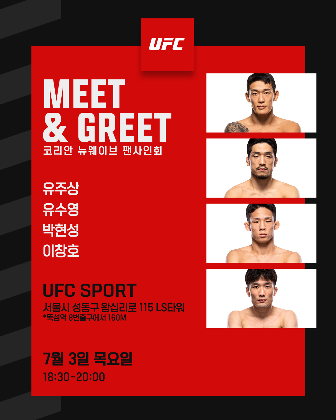 UFC는 오는 7월 3일 오후 6시 30분 서울 성동구 UFC SPORT 성수점에서 '좀비 주니어' 유주상(31), '피스 오브 마인드' 박현성(29), 'K-머신' 이창호(31), '유짓수' 유수영(29)이 참여하는 '코리안 뉴웨이브' 팬 사인회를 개최한다.