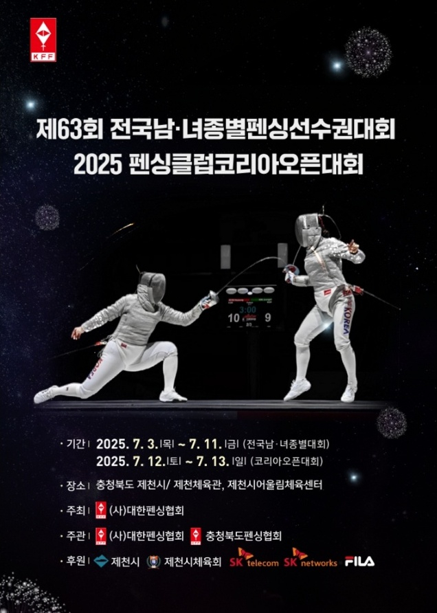 대한펜싱협회(회장사 SK텔레콤)는 오는 3일부터 13일까지 제63회 전국남·녀종별펜싱선수권대회와 2025 펜싱 클럽 코리아 오픈 대회를 충북 제천체육관과 제천시어울림체육센터에서 개최한다고 밝혔다. 이번 대회에는 전국 15개 시·도 총 3000여 명과 800여 팀이 참가해 11일간 열전을 펼친다.